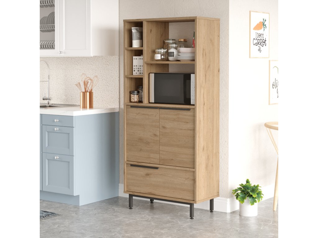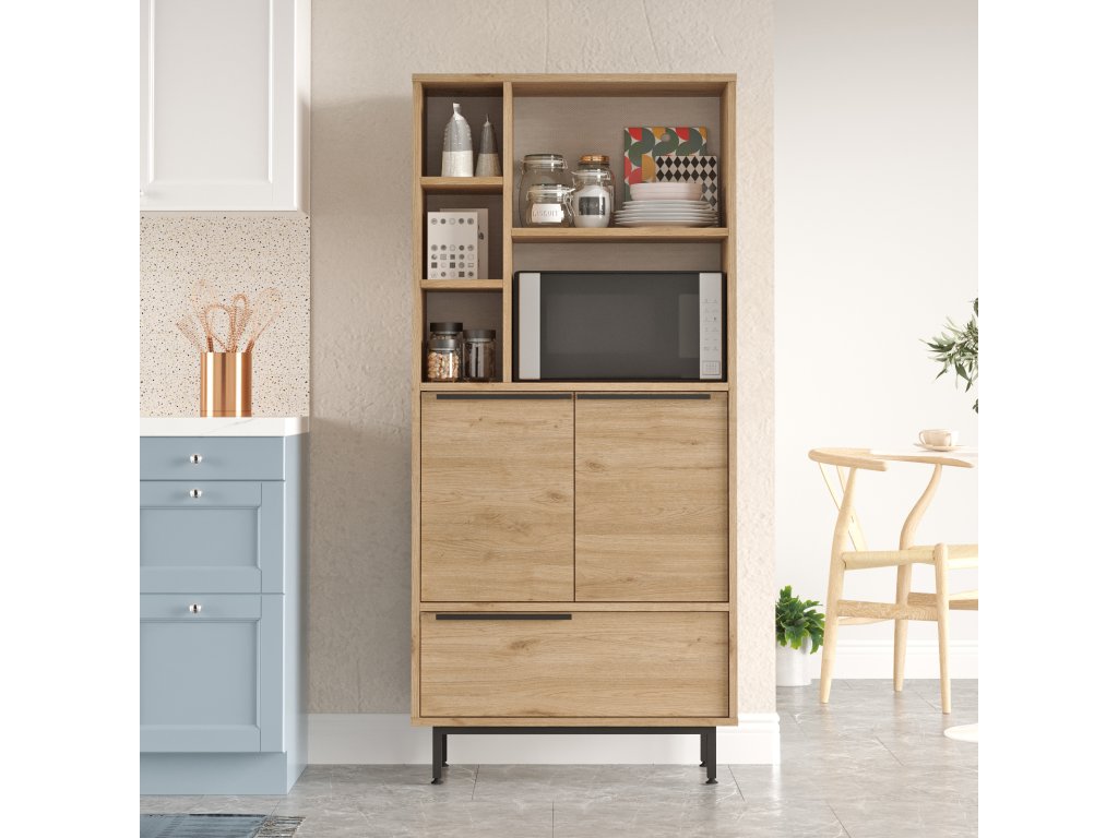 Skříňka je praktickým a stylovým řešením pro vaši kuchyň. Vyrobena z kvalitního LTD materiálu a kovu, tato vysoká skříňka nabízí dostatek úložného prostoru a elegantní design. Díky plným dvířkům a regálku poskytuje ideální místo pro mikrovlnku, kuchyňské spotřebiče a další nezbytnosti.