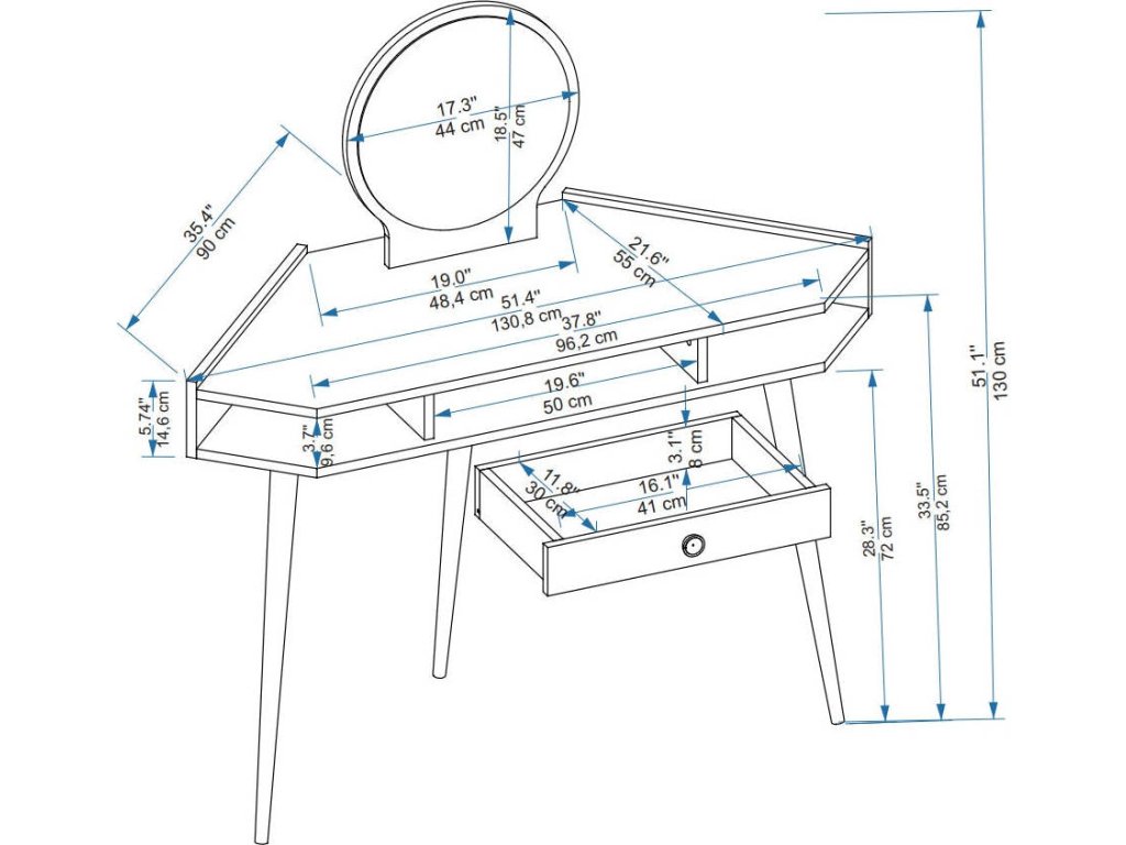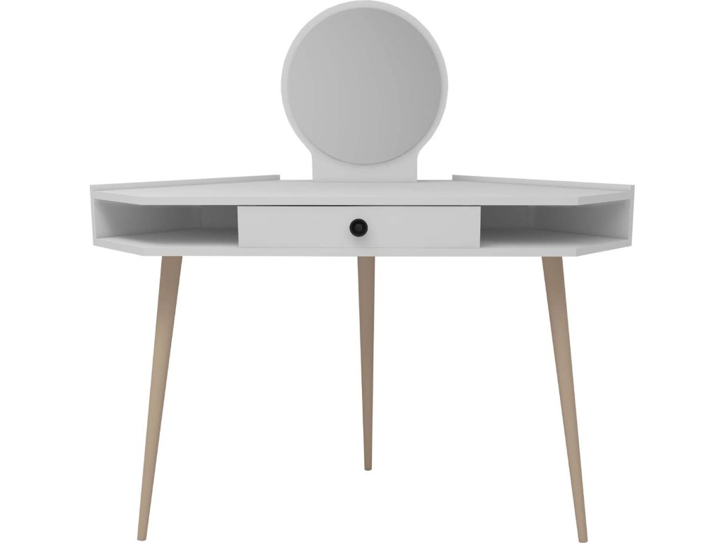 Toaletní stolek je ideálním řešením pro ložnice, které potřebují elegantní a funkční doplněk. Díky svému rohovému designu efektivně využívá prostor a nabízí praktické vybavení, včetně zásuvky, regálku a integrovaného zrcadla. Dřevěné nohy přidávají na stabilitě a estetickém dojmu, zatímco kvalitní materiály zajišťují dlouhou životnost.