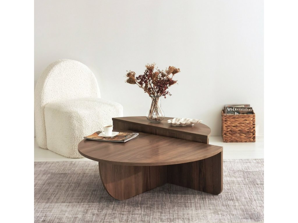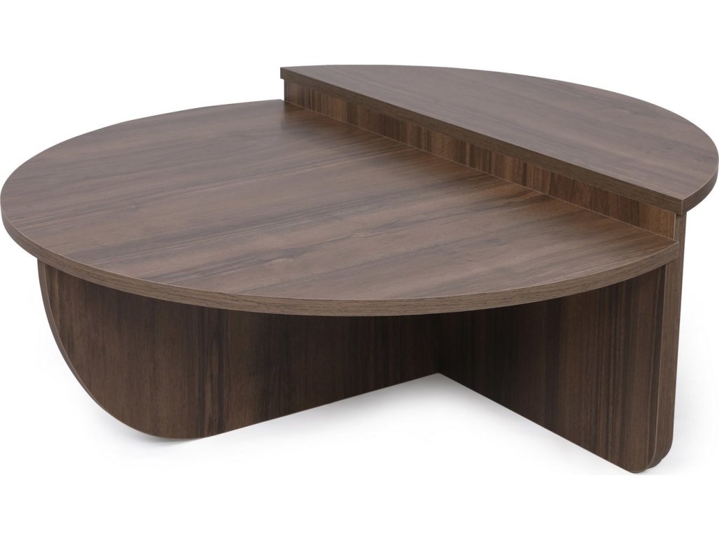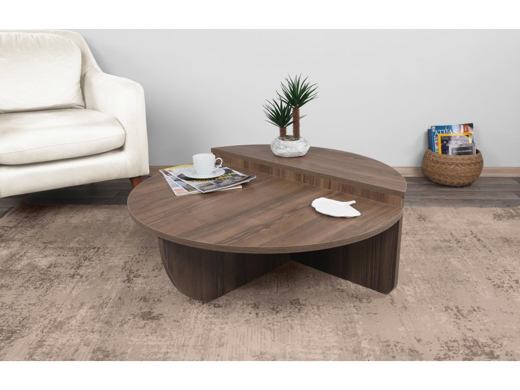 Stolek je navržen s ohledem na praktičnost a moderní styl. Jeho složitelný design umožňuje snadné skladování a flexibilní použití, což oceníte v menších i větších prostorách. Atypický tvar a povrch v dekoru ořech dodávají interiéru jedinečný a elegantní vzhled.