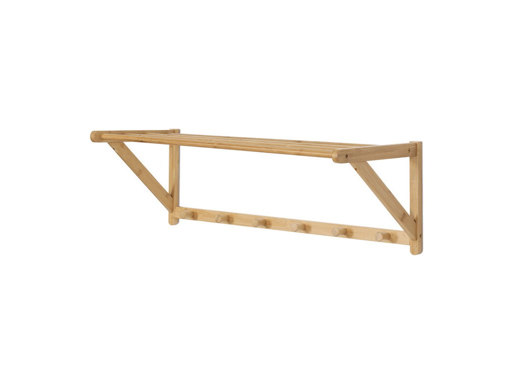 Nástěnná police s věšáky je vyrobena z masivního bambusu v přírodním odstínu, který přináší do interiéru příjemnou a teplou atmosféru. Police nabízí praktické horní místo pro odkládání drobných předmětů či dekorací, zatímco spodní část je vybavena šesti pevnými věšáky pro zavěšení kabátů, klobouků nebo tašek. Bambusové provedení se snadno udržuje a díky pevné montáži na stěnu zajišťuje stabilitu a dlouhou životnost. Design s hladce zaoblenými hranami a přírodní texturou materiálu podtrhuje jednoduchost a funkčnost produktu. Rozměry a nosnost odpovídají běžným požadavkům na domácí i kancelářské využití.