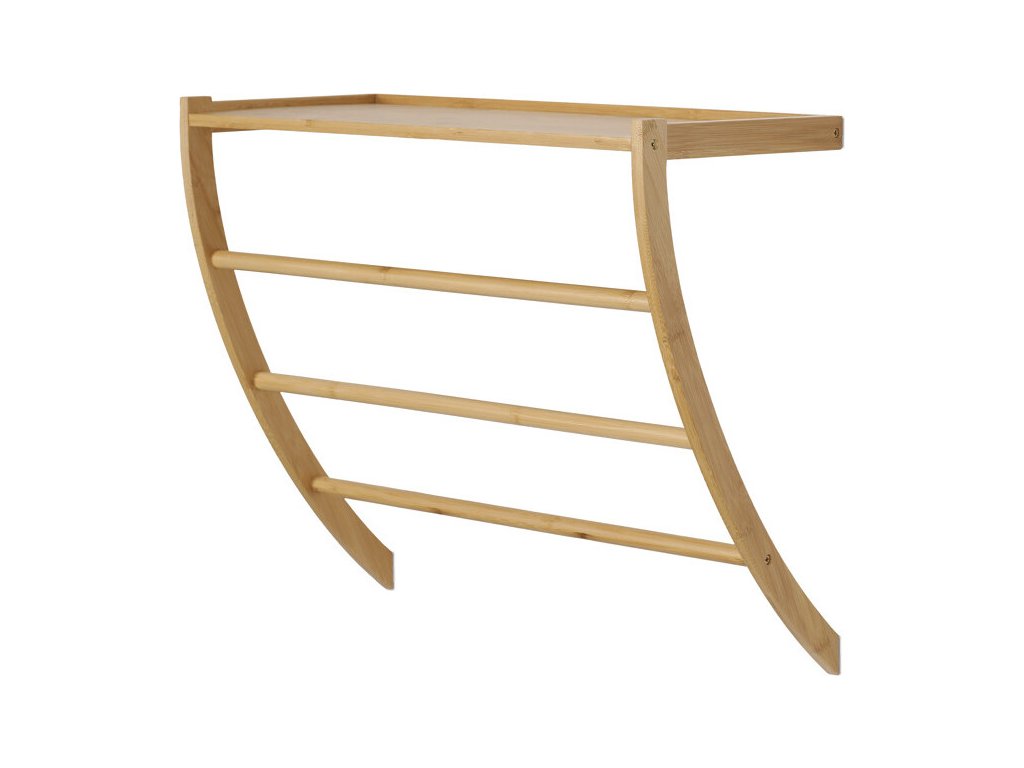 Nástěnná police z masivního bambusu v přírodním odstínu kombinuje funkčnost s přírodním vzhledem. Její elegantní obloukový tvar a dvě vodorovné tyče pod policí umožňují praktické zavěšení drobných předmětů nebo textilií. Povrch bambusu je hladký a snadno udržovatelný, což zajišťuje dlouhou životnost a přirozený vzhled. Police je vhodná pro umístění v chodbě, koupelně nebo obývacím pokoji, kde poslouží jako stylový a praktický doplněk interiéru.