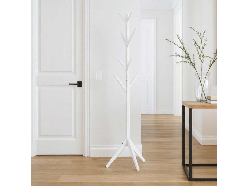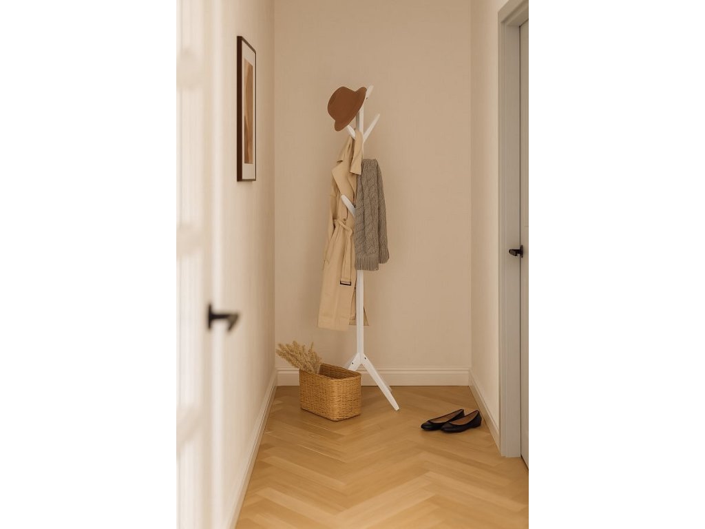 Moderní stojanový věšák s minimalistickým designem. Více háčků pro pohodlné zavěšení oblečení či doplňků. Stabilní základna zajišťuje pevnost a odolnost
