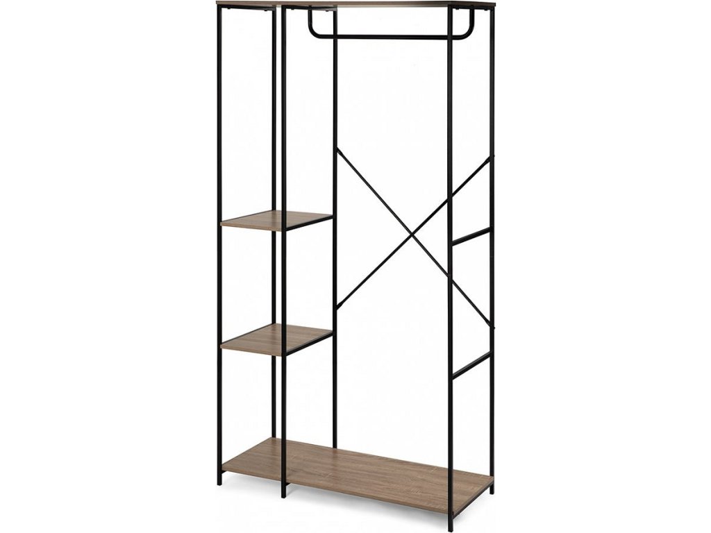 Multifunkční šatní stojan s moderním a minimalistickým designem. Otevřený úložný prostor s tyčí na zavěšení oblečení a třemi policemi na doplňky či boty. Stabilní kovová konstrukce doplněná odolnými deskami. Ideální řešení do předsíně, ložnice nebo šatny. Spojuje praktičnost, přehlednost a elegantní vzhled.