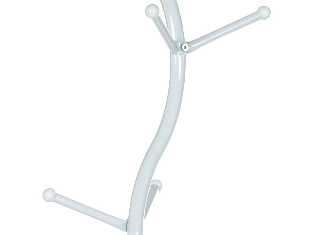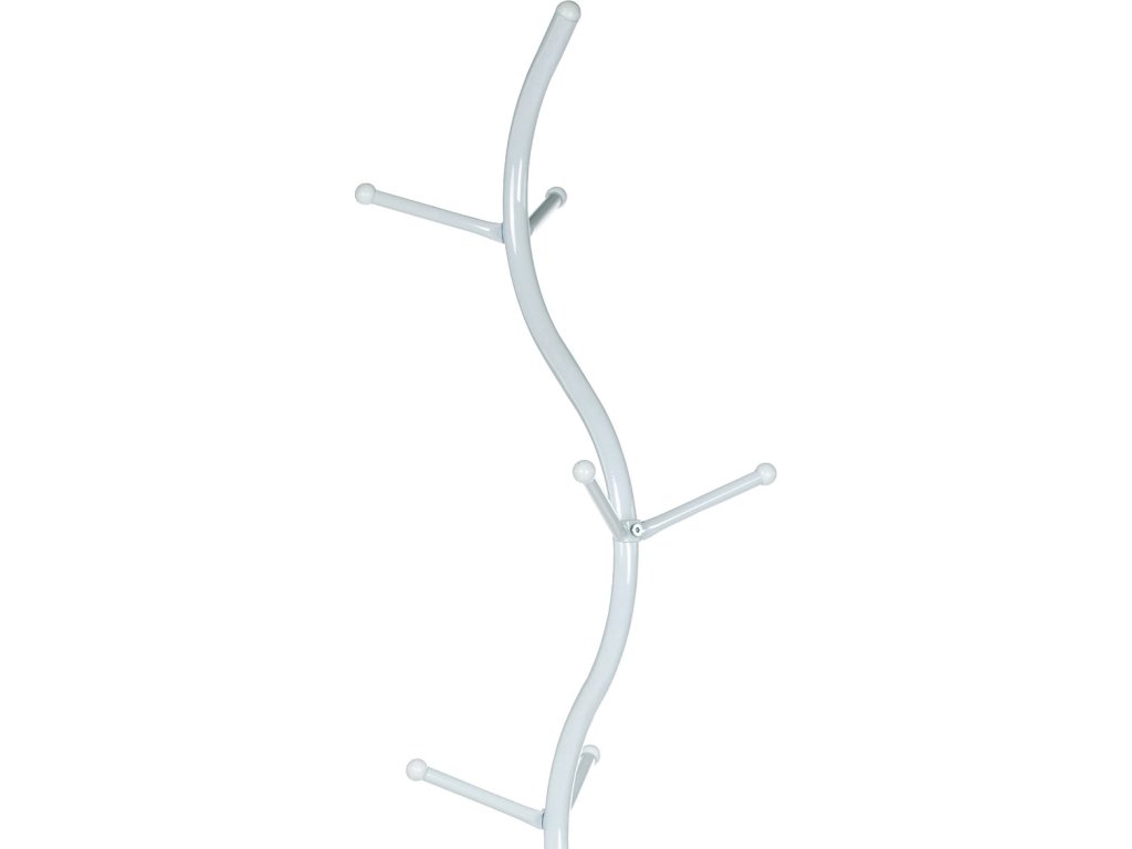 Stojanový věšák s výškou 180 cm je vyroben z pevného kovu s matným bílým lakem, který zajišťuje odolnost proti poškození a snadnou údržbu. Jeho design tvoří elegantně prohnutá centrální tyč s šesti rozloženými háčky různých délek, které umožňují pohodlné zavěšení kabátů, klobouků či tašek. Stabilní kulatá základna přispívá k celkové stabilitě věšáku, který unese až 10 kg. Díky svému jednoduchému a modernímu vzhledu se hodí do vstupních hal, kanceláří i domácností.
