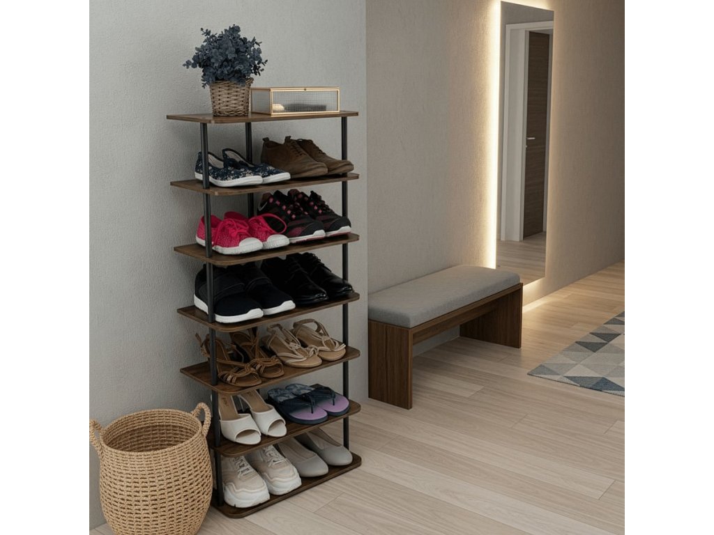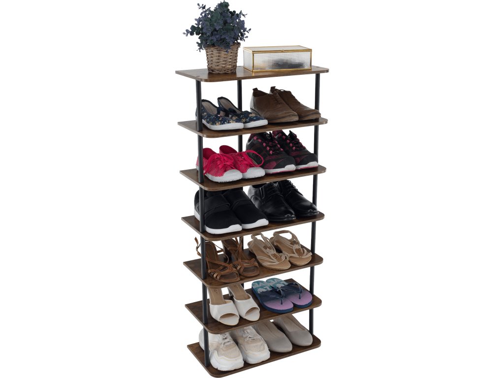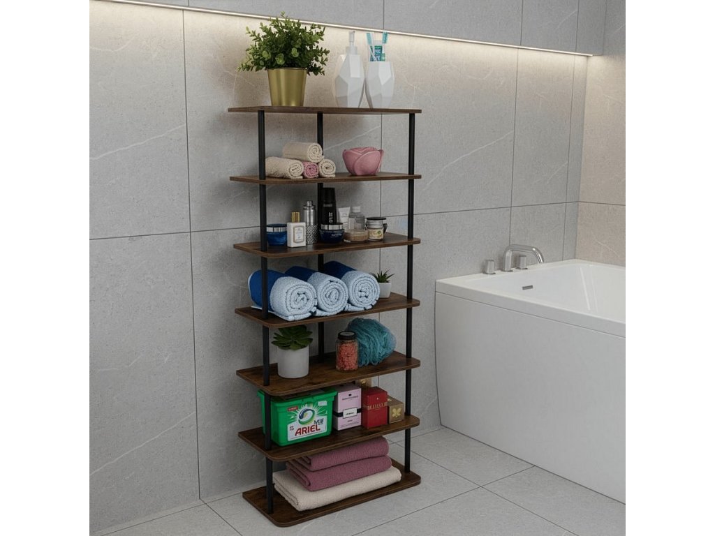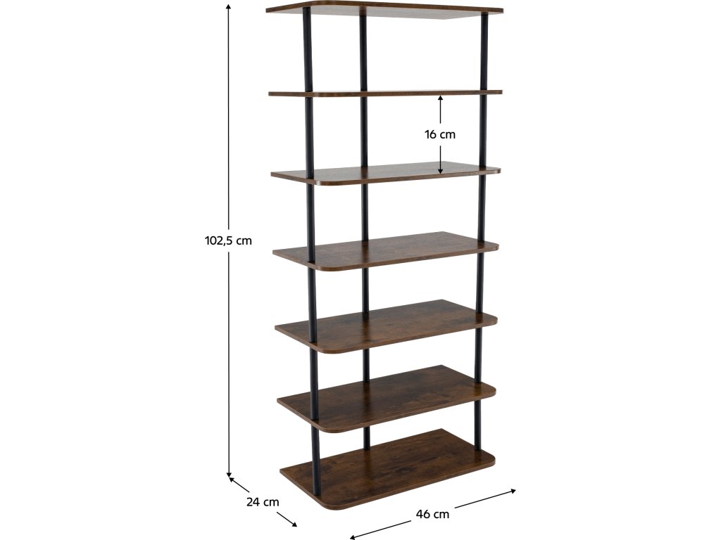 Materiál: kov/DTD Barva: černá/rustikální dřevo Rozměry (ŠxHxV): 46x24x102,5 cm Tloušťka tyče: 1,6 cm Nosnost na polici: 5 kg-10 kg Výška police: 16 cm 6-řadý Víceúčelový Dodáváno v demontu