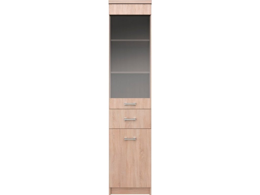 Vitrína 1D1W1S TOPTY TYP 32 Materiál: DTD laminovaná Barva: dub sonoma Rozměry (ŠxHxV): 40x33x183 cm Jednodveřová Jeden šuplík Univerzální Vitrína se skleněnými dvířky1 Úložný prostor Dodáváno v demontu.