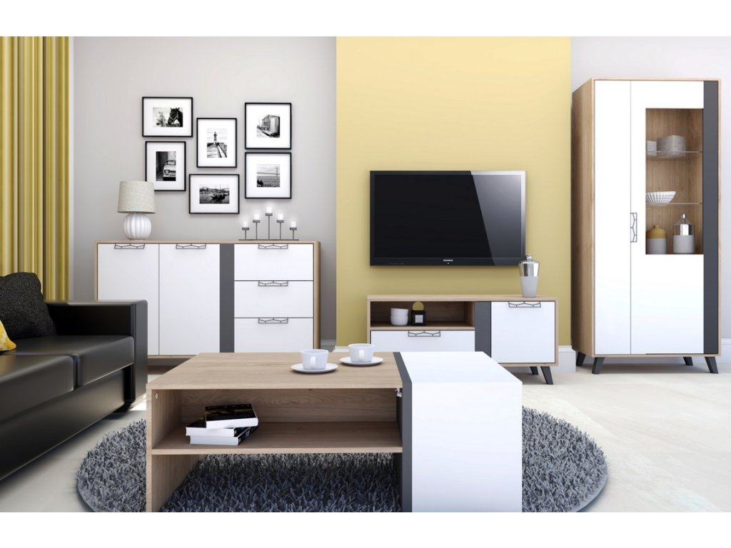 CASA 75097 Vitrína jednodveřová v moderním provedení. Korpus je vyroben z kvalitní desky LTD v barvě ořech americký jackson, dvířka jsou vyrobeny z desky MDF v kombinaci barev bílá mat/grafit mat. Úchyty jsou kovové v barvě grafit mat, nožky jsou plastové taktéž v barvě grafit mat. Dodáváme v demontovaném stavu.
