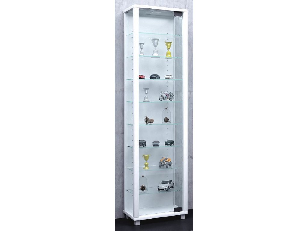 Vitrína EDANA s 8 variabilními policemi na prezentaci vašich sbírek či dekoračních předmětů ve vysokém standardu provedení. Vhodná jak do domácnosti, tak také v kancelářích či obchodních prostorech. Dveře, boční stěny i police jsou z čirého skla.