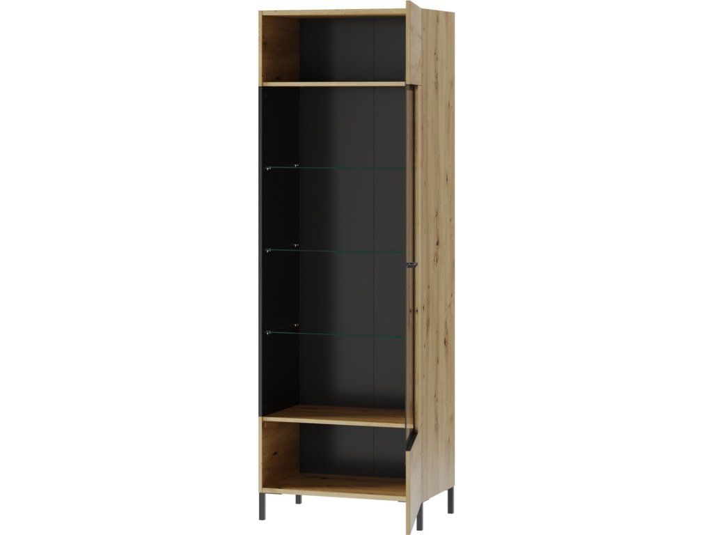 CASA 75091 Vitrína jednodveřová. Korpus i dvířka jsou z kvalitní desky LTD v barvě dub artisan/černá mat, dvířka z tvrzeného skla jsou usazené v černém kovovém rámu. Dvířka je možné namontovat na pravou nebo levou stranu. K vitríně můžete dokoupit také LED osvětlení. Úchyty jsou z plastu v černé barvě, nožky jsou kovové černé. Dodáváme v demontovaném stavu.