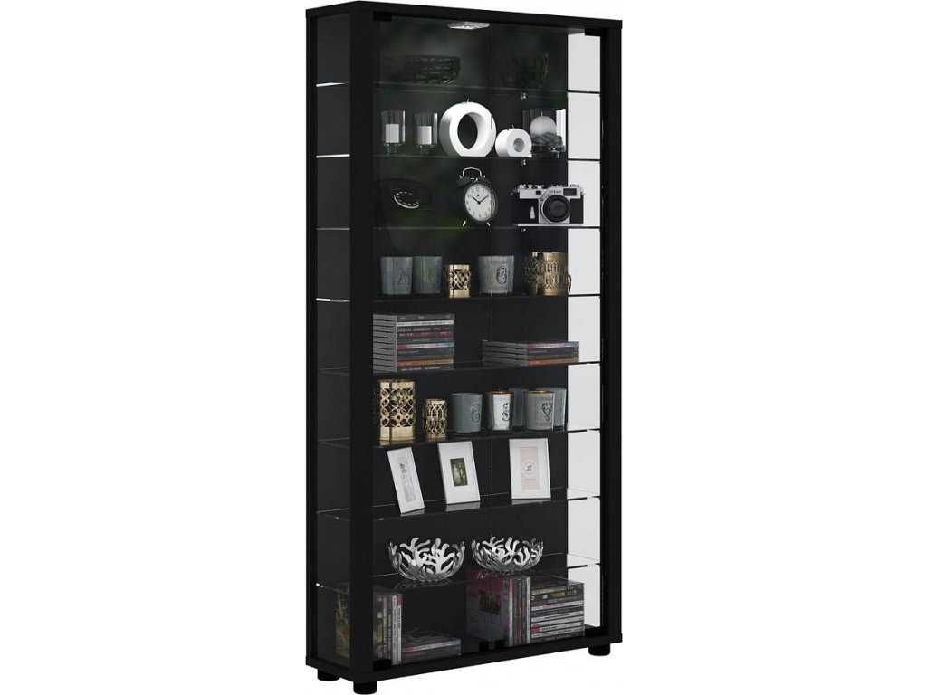Polovysoká elegantní vitrína LUMO Maxi se dveřmi, bočnicemi a 8 variabilními policemi z čirého tvrzeného bezpečnostního skla. Rám i stabilní zadní stěna jsou vyrobeny z kvalitní repliky dřeva.