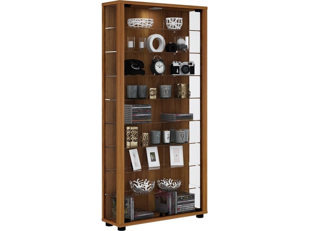 Polovysoká elegantní vitrína LUMO Maxi se dveřmi, bočnicemi a 8 variabilními policemi z čirého tvrzeného bezpečnostního skla. Rám i stabilní zadní stěna jsou vyrobeny z kvalitní repliky dřeva.