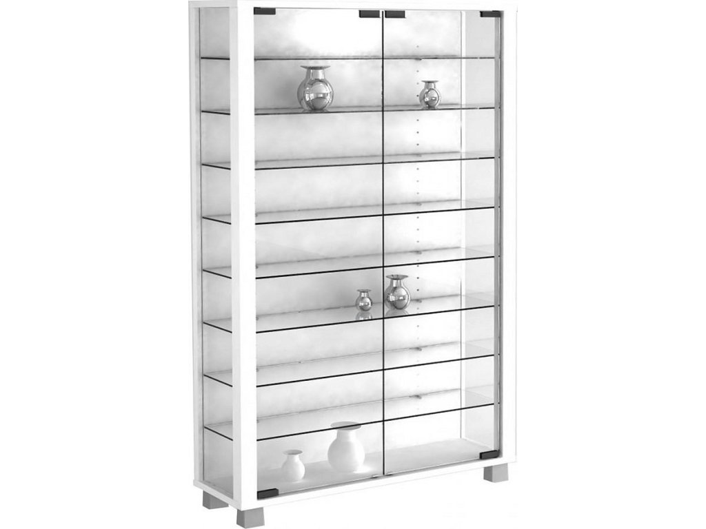 Elegantní vitrína LUMO Mini s dvířky, bočnicemi a 8 variabilními policemi z čirého tvrzeného bezpečnostního skla. Rám i stabilní zadní stěna jsou vyrobeny z kvalitní imitace dřeva.