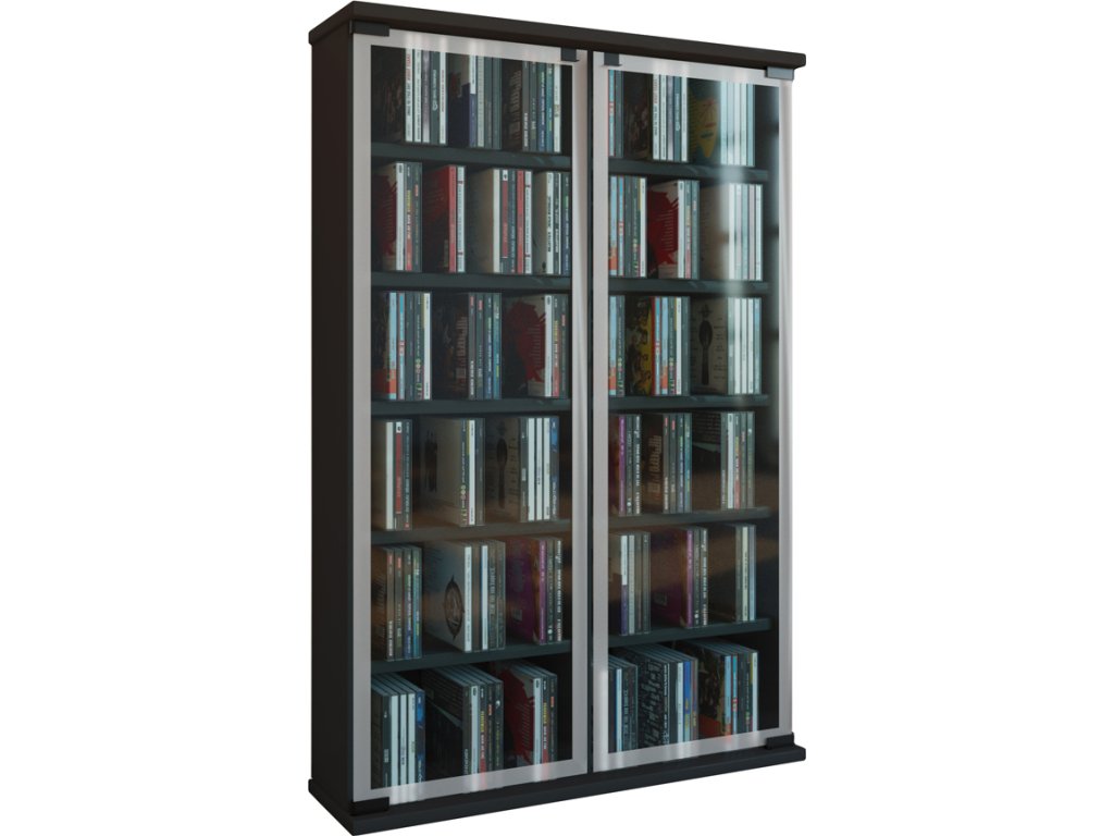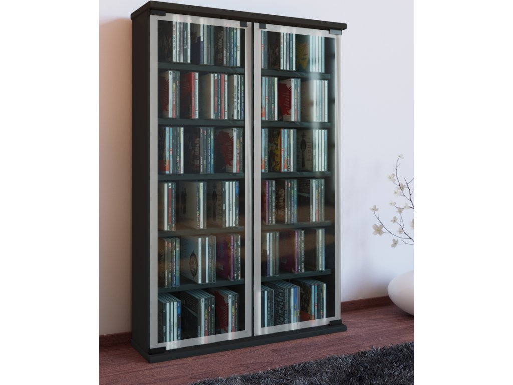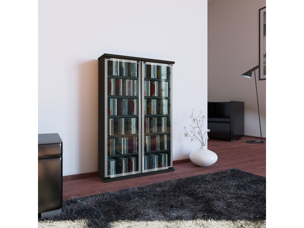 Praktická skříňka Galerie pro odkládání CD, DVD nebo VHS opatřená dvěmi skleněnými dvířky z bezpečnostního skla s okrasným matným okrajem.