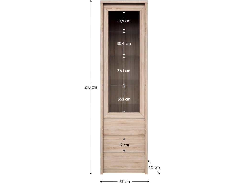 Vitrína s šuplíkem 1W3S NORTY TYP 4 Materiál: DTD laminovaná Provedení: dub sonoma Rozměry (ŠxHxV): 57x40x210 cm Tloušťka materiálu: 32 mm Tloušťka materiálu zbývající části: 16 mm Dodávané v demontu.