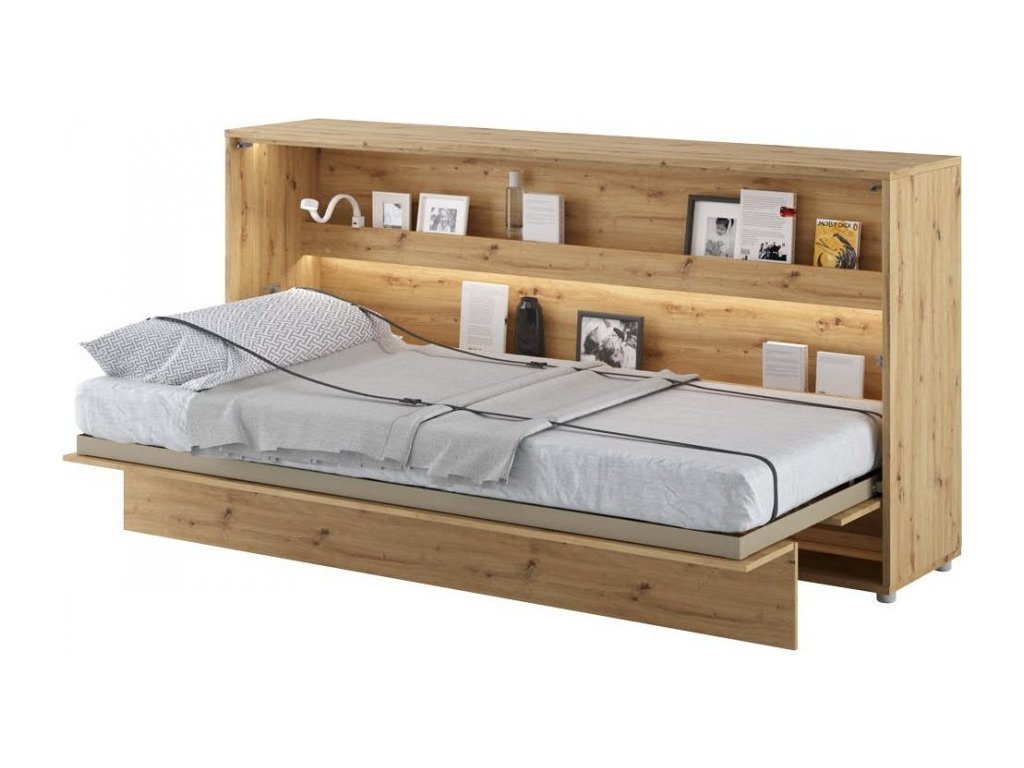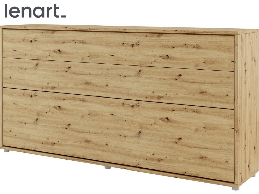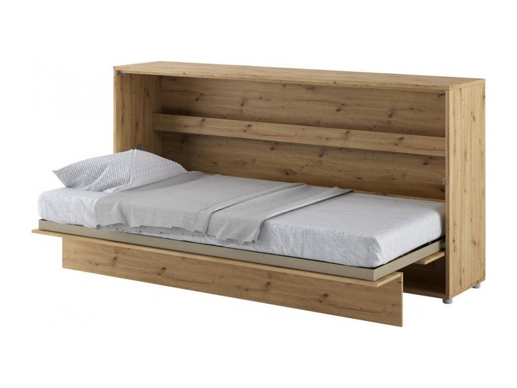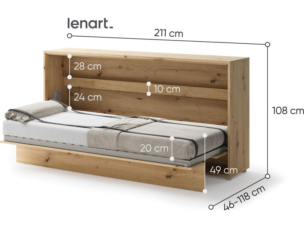 CASA 73026 Široká výklopná postel 90 dub artisan. Rozměry viz obrázek. Se sklápěcí postelí Vás už nebude trápit malý prostor Vaší domácnosti. Díky stabilní konstrukci zaručuje pohodlný odpočinek. Pneumatický mechanismus sklápění postele zajistí bezpečné otevírání a je doplněn SOFT CLOSE systémem tichého zavírání. Tento výjimečný systém Vám umožní manipulaci pouze jedním prstem. Když je postel sklopená, vypadá jako běžná skříň. Vyklopením se vytáhne celá šířka postele. Při lozložení postele má hloubku 118 cm. Uvnitř skříně jsou praktické police na knížky nebo dekorační předměty, vše máte na dosah ruky. Maximální zatížení polic je 5 kg. Rám je nutno přišroubovat ke zdi, nosnost postele je 100 kg. Rošt postele je v ceně, matrace není součástí, je potřeba ji dokoupit. Doporučujeme velikost 90 x 200 x výšku do 18 cm. Po sklopení postele vzniká prostor pod postelí o výšce 24,9 cm. Nábytek je vyroben z kvalitního lamina s ABS hranou. Lamino je odolné proti poškrábání, poškození, vlhkosti a vysokým teplotám. Postel nabízíme v několika velikostech a barevných provedeních. K posteli je možné dokoupit LED osvětlení. Dodáváme v demontovaném stavu.