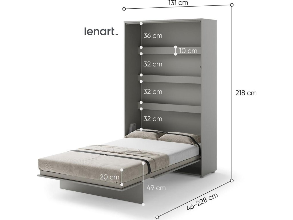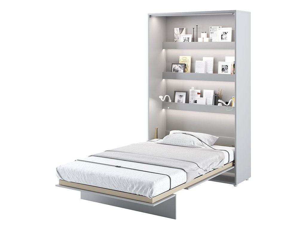 CASA 73026 Vysoká výklopná postel 120 šedá mat. Rozměry viz obrázek. Se sklápěcí postelí Vás už nebude trápit malý prostor Vaší domácnosti. Díky stabilní konstrukci zaručuje pohodlný odpočinek. Pneumatický mechanismus sklápění postele zajistí bezpečné otevírání a je doplněn SOFT CLOSE systémem tichého zavírání. Tento výjimečný systém Vám umožní manipulaci pouze jedním prstem. Když je postel sklopená, vypadá jako běžná skříň. Vyklopením se vytáhne celá délka postele. Při lozložení postele má hloubku 228 cm. Uvnitř skříně jsou praktické police na knížky nebo dekorační předměty, vše máte na dosah ruky. Maximální zatížení polic je 5 kg. Rám je nutno přišroubovat ke zdi, nosnost postele je 150 kg. Rošt postele je v ceně, matrace není součástí, je potřeba ji dokoupit. Doporučujeme velikost 120 x 200 x výšku do 18 cm. Po sklopení postele vzniká prostor pod postelí o výšce 24,9 cm. Nábytek je vyroben z kvalitního lamina s ABS hranou. Lamino je odolné proti poškrábání, poškození, vlhkosti a vysokým teplotám. Postel nabízíme v několika velikostech a barevných provedeních. K posteli je možné dokoupit LED osvětlení. Dodáváme v demontovaném stavu.