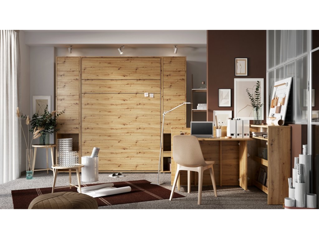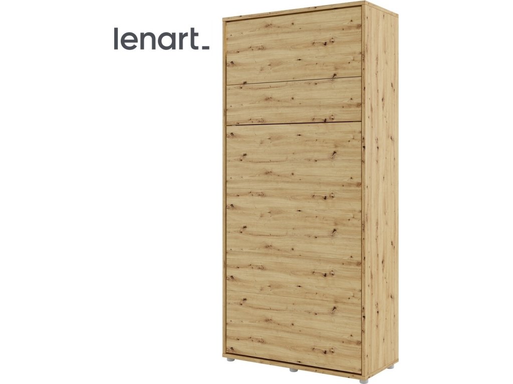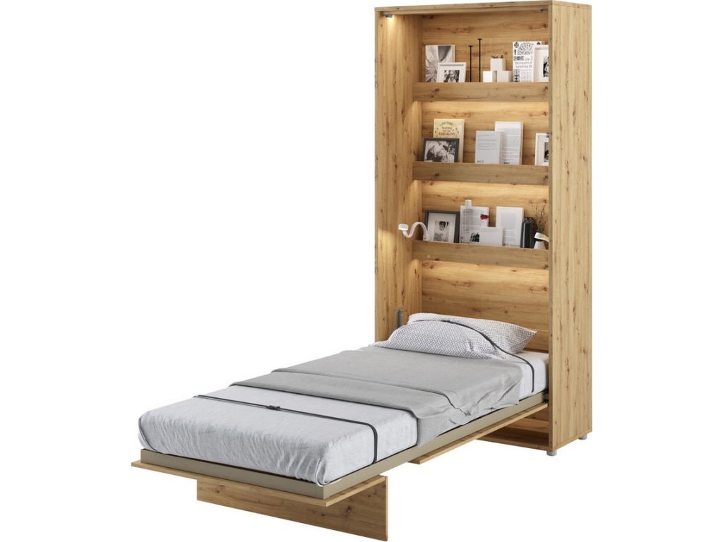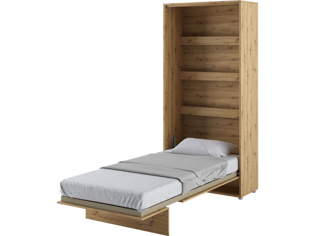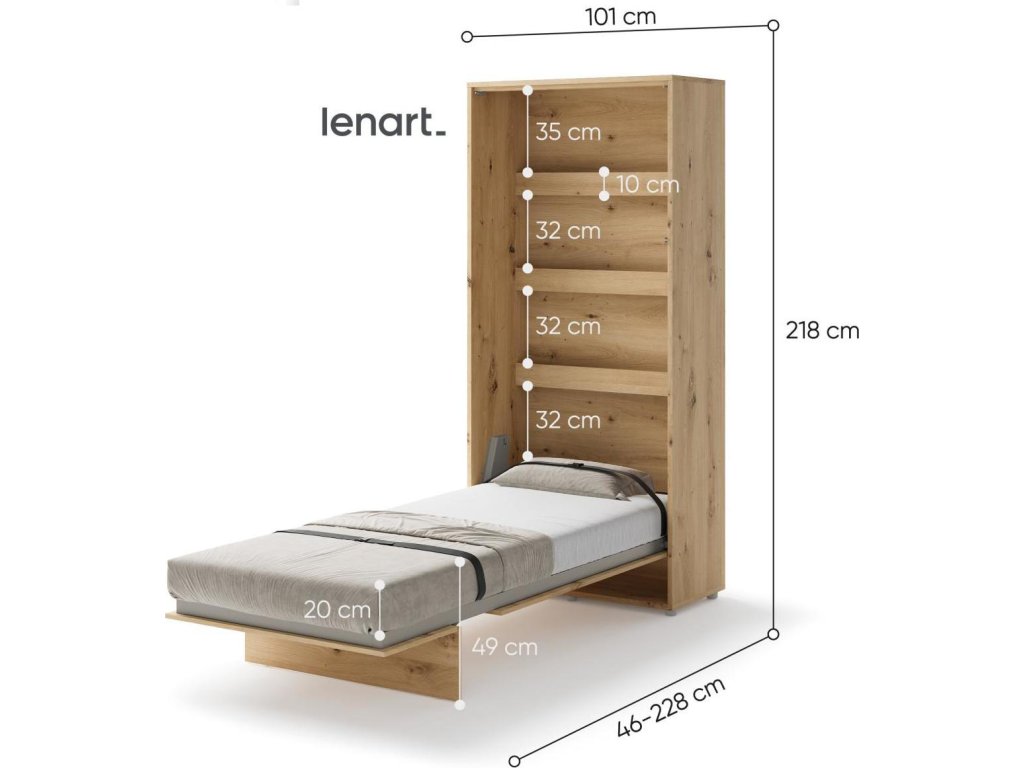 CASA 73026 Vysoká výklopná postel 90 dub artisan. Rozměry viz obrázek. Se sklápěcí postelí Vás už nebude trápit malý prostor Vaší domácnosti. Díky stabilní konstrukci zaručuje pohodlný odpočinek. Pneumatický mechanismus sklápění postele zajistí bezpečné otevírání a je doplněn SOFT CLOSE systémem tichého zavírání. Tento výjimečný systém Vám umožní manipulaci pouze jedním prstem. Když je postel sklopená, vypadá jako běžná skříň. Vyklopením se vytáhne celá délka postele. Při lozložení postele má hloubku 226 cm. Uvnitř skříně jsou praktické police na knížky nebo dekorační předměty, vše máte na dosah ruky. Maximální zatížení polic je 5 kg. Rám je nutno přišroubovat ke zdi, nosnost postele je 100 kg. Rošt postele je v ceně, matrace není součástí, je potřeba ji dokoupit. Doporučujeme velikost 90 x 200 x výšku do 18 cm. Po sklopení postele vzniká prostor pod postelí o výšce 24,9 cm. Nábytek je vyroben z kvalitního lamina s ABS hranou. Lamino je odolné proti poškrábání, poškození, vlhkosti a vysokým teplotám. Postel nabízíme v několika velikostech a barevných provedeních. K posteli je možné dokoupit LED osvětlení. Dodáváme v demontovaném stavu.