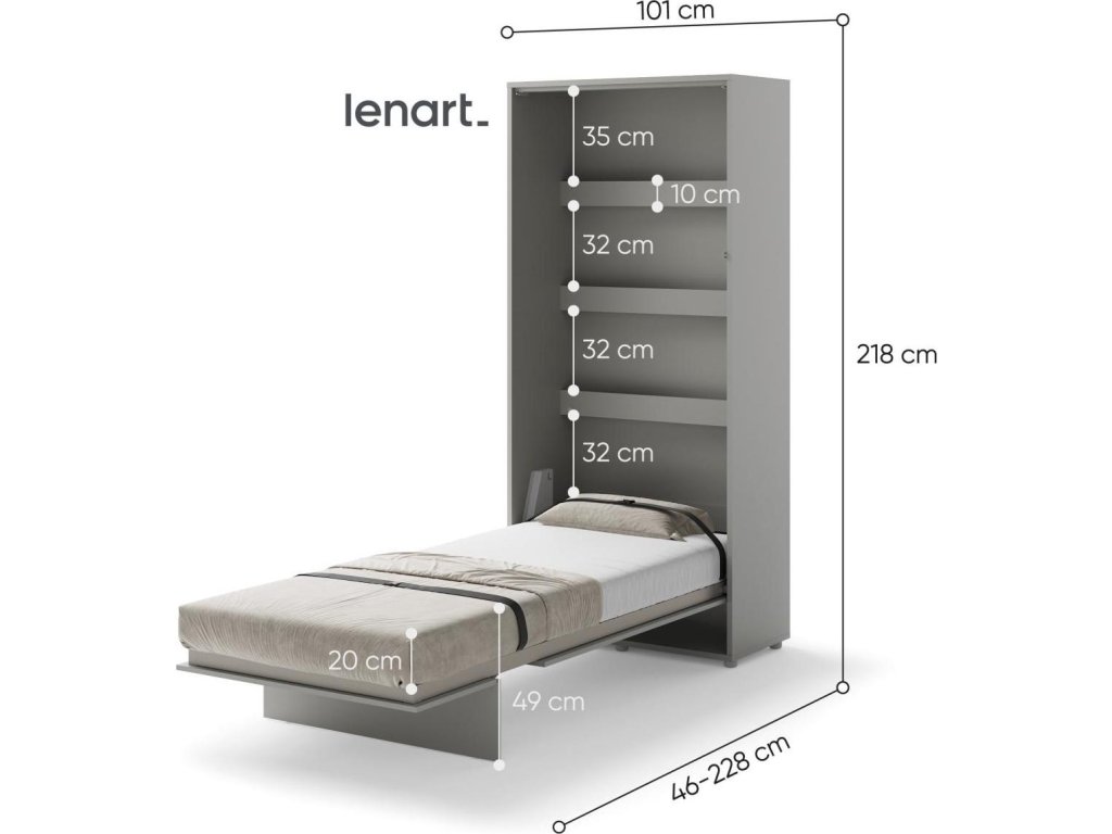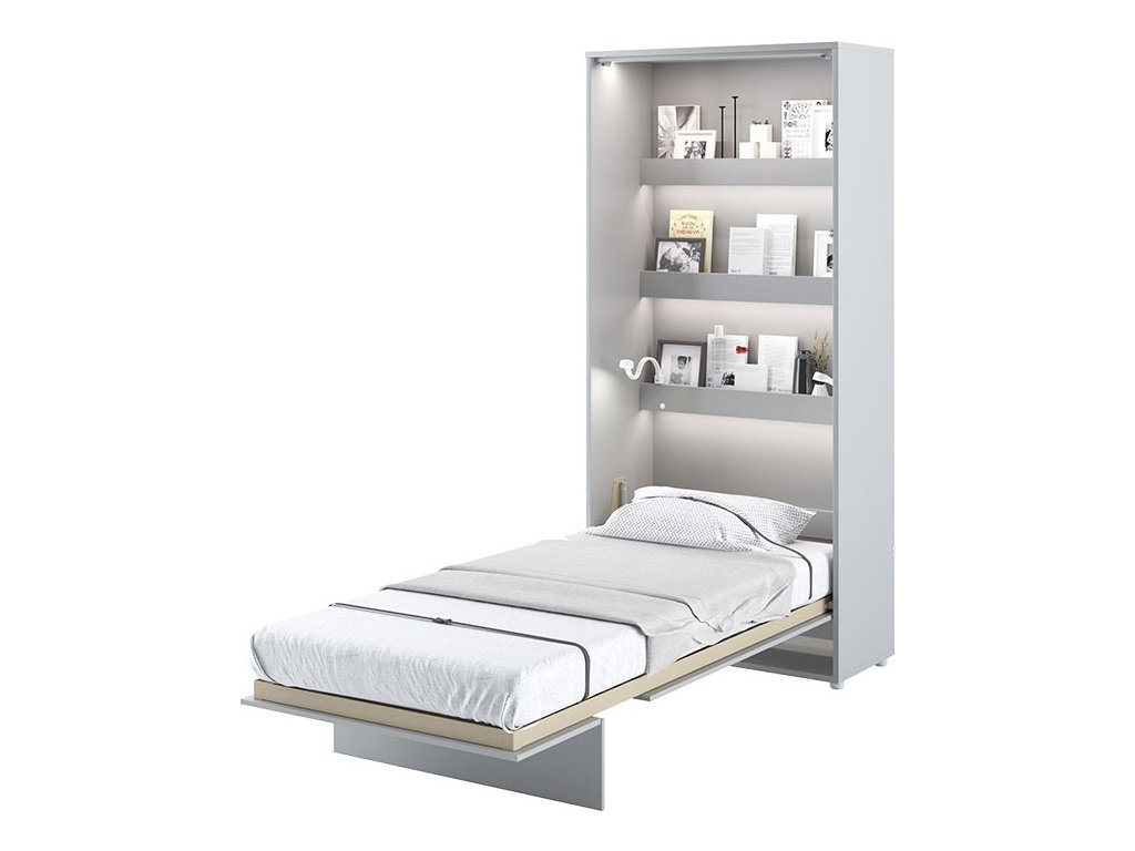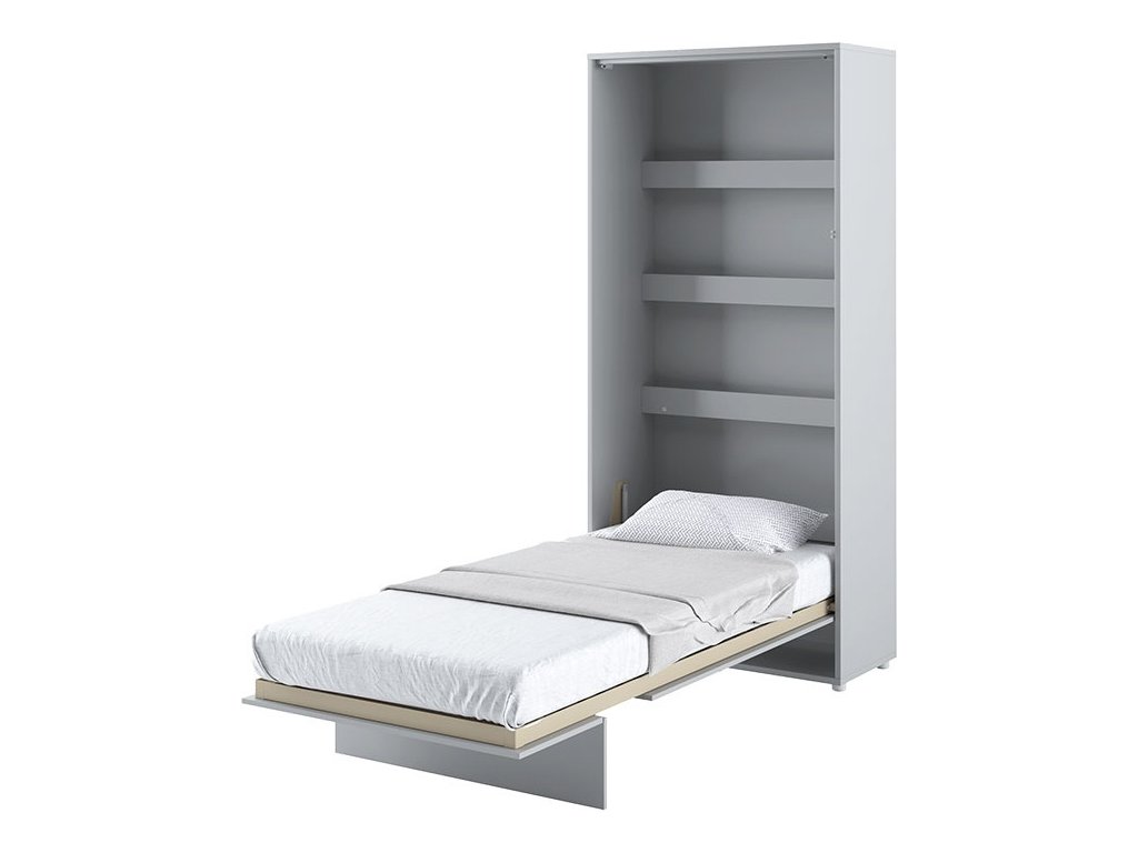 CASA 73026 Vysoká výklopná postel 90 šedá mat. Rozměry viz obrázek. Se sklápěcí postelí Vás už nebude trápit malý prostor Vaší domácnosti. Díky stabilní konstrukci zaručuje pohodlný odpočinek. Pneumatický mechanismus sklápění postele zajistí bezpečné otevírání a je doplněn SOFT CLOSE systémem tichého zavírání. Tento výjimečný systém Vám umožní manipulaci pouze jedním prstem. Když je postel sklopená, vypadá jako běžná skříň. Vyklopením se vytáhne celá délka postele. Při lozložení postele má hloubku 226 cm. Uvnitř skříně jsou praktické police na knížky nebo dekorační předměty, vše máte na dosah ruky. Maximální zatížení polic je 5 kg. Rám je nutno přišroubovat ke zdi, nosnost postele je 100 kg. Rošt postele je v ceně, matrace není součástí, je potřeba ji dokoupit. Doporučujeme velikost 90 x 200 x výšku do 18 cm. Po sklopení postele vzniká prostor pod postelí o výšce 24,9 cm. Nábytek je vyroben z kvalitního lamina s ABS hranou. Lamino je odolné proti poškrábání, poškození, vlhkosti a vysokým teplotám. Postel nabízíme v několika velikostech a barevných provedeních. K posteli je možné dokoupit LED osvětlení. Dodáváme v demontovaném stavu.