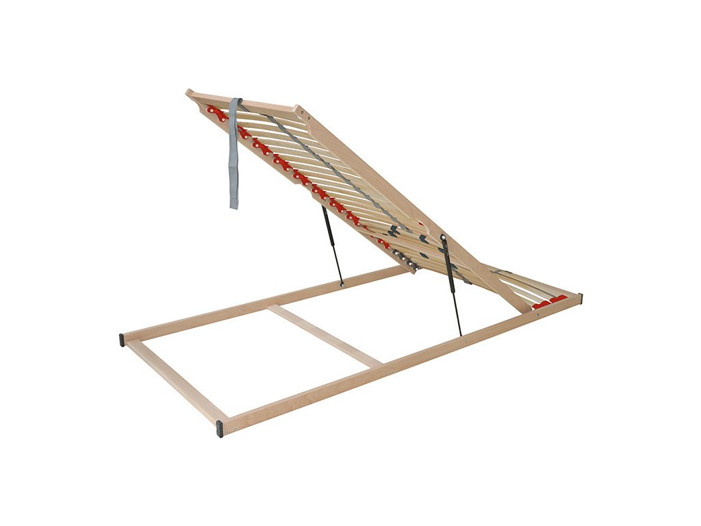 CASA 65006 Lamelový rošt ze dřeva v šíři 90 cm. Rošt má 28 lamel v pružných kaučukových pouzdrech ( kaučukové výkyvné duo kapsy na kolíku ). U hlavy jsou 4 ks pevných lamel, další část se dá zvednout. Rovnoměrně rozkládá váhu těla na plochu matrace, obsahuje posuvné objímky pro individuální nastavení tuhosti v bederní oblasti ( 5 výztuh ). Obsahuje také středový popruh pro zlepšení stability roštu. Nosnost roštu je 120 kg. Rošt je výklopný pomocí plynových pístů. Vhodný k postelím s úložným prostorem, kde vkládáte věci od nohou.