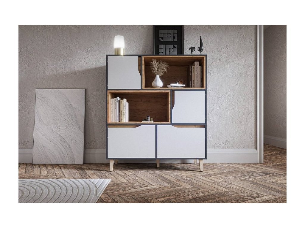 Nízký regál nabízí bohatý úložný prostor v podobě otevřeného regálu a zavřených skříněk. Je ideální do studentských pokojů, obývacího pokoje nebo ložnice.
