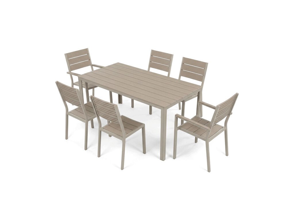 Zahradní sestava AZS-B1656 CRM nabízí praktické a pevné řešení pro venkovní posezení. Stůl o rozměrech 156 × 78 cm má desku z polywoodu, materiálu odolného vůči povětrnostním vlivům a snadno udržovatelného, který věrně napodobuje vzhled dřeva. Rám stolu i židlí je vyroben z kovu v béžovém odstínu s práškovou povrchovou úpravou, která zajišťuje stabilitu a dlouhou životnost. Sada obsahuje šest židlí, z nichž dvě mají opěrky a područky pro pohodlnější sezení, zatímco ostatní jsou bez područek, což umožňuje variabilní uspořádání. Design s vodorovnými lamelami na sedácích a opěradlech podtrhuje moderní a zároveň nadčasový vzhled celé sestavy.