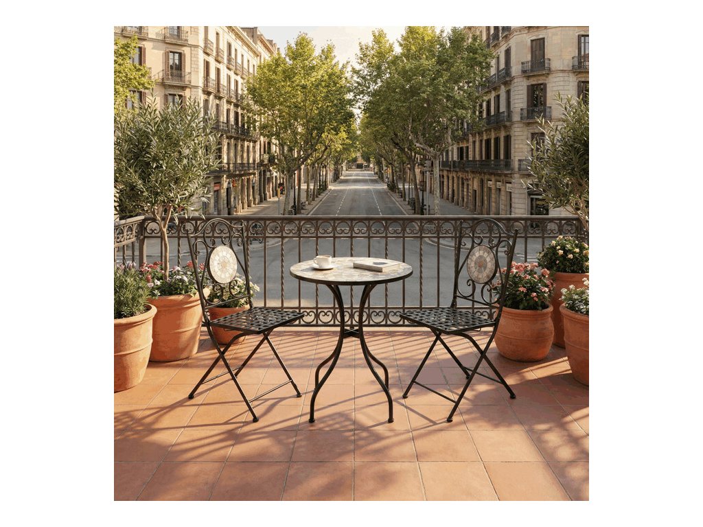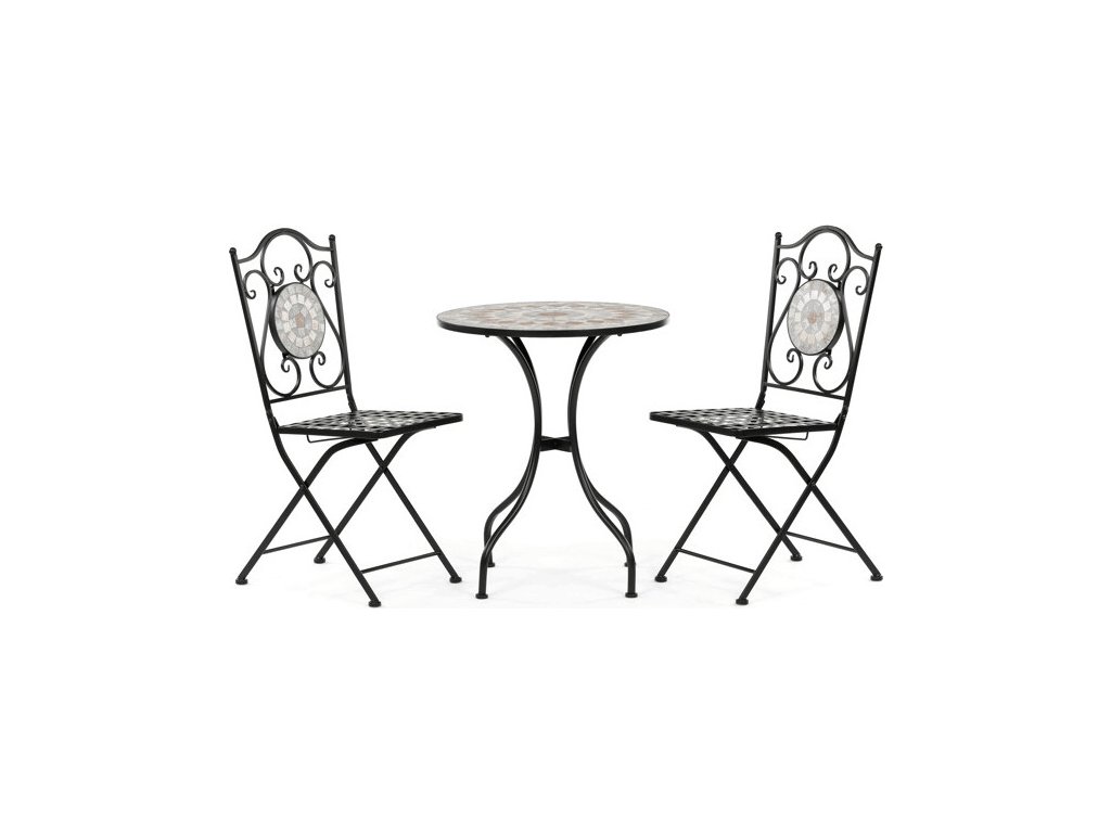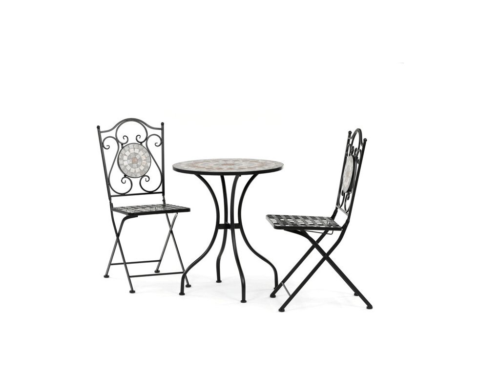 Zahradní set US1400 se skládá z kulatého stolu a dvou židlí s pevnou kovovou konstrukcí v černém provedení. Deska stolu je vyrobena z keramické mozaiky, která kombinuje přírodní odstíny a vytváří dekorativní vzor s dlouhou životností a snadnou údržbou. Židle mají sedáky s mřížkovým vzorem a opěradla zdobí keramické kruhové vložky, které ladí s designem stolu. Stabilní kovová podnož zajišťuje pevnost a odolnost setu, vhodného pro použití na balkónech i zahradách. Kompaktní rozměry umožňují pohodlné usazení dvou osob a přispívají k praktickému využití prostoru.