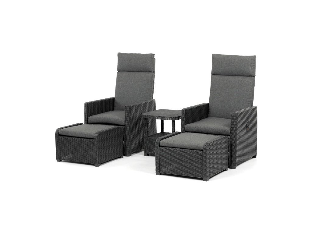 Zahradní set 1+2 v šedém provedení kombinuje pevný kovový rám s výplní z polyratanu které zajišťuje snadnou údržbu a dlouhou životnost i při venkovním použití. Sada obsahuje dvě polohovací křesla s nastavitelným sklonem opěradla pro maximální komfort a dva bonusové taburety, které lze využít jako podnožky nebo další sedací plochy. Součástí je také praktický stolek s deskou z umělého ratanu, který doplňuje celkový vzhled a funkčnost setu. Ideální volba pro relaxaci na zahradě, terase či balkóně.