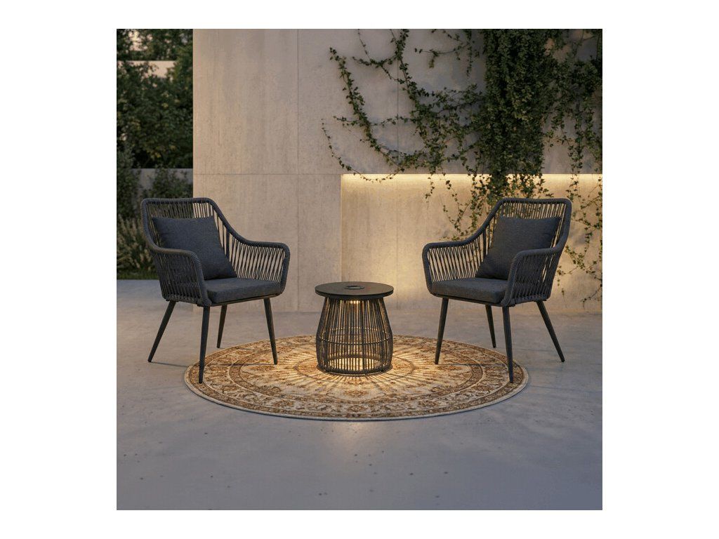 Zahradní set 1+2 v šedém provedení kombinuje pevnou kovovou konstrukci s komfortním čalouněním z látky, která je navržena pro snadnou údržbu a dlouhou životnost. Součástí setu jsou dvě pohodlná křesla s ergonomicky tvarovanými opěrkami a měkkými polštáři, které zajišťují příjemné posezení. Stolová deska je vyrobena z tvrzeného skla, které je odolné vůči poškrábání a snadno se čistí. Inovativní solární podsvícení stolku vytváří příjemnou atmosféru večerního posezení a zároveň je energeticky úsporné. Celý set je ideální pro relaxaci na terase či zahradě, přičemž jeho stabilní konstrukce zaručuje bezpečnost a nosnost vhodnou pro běžné užívání.