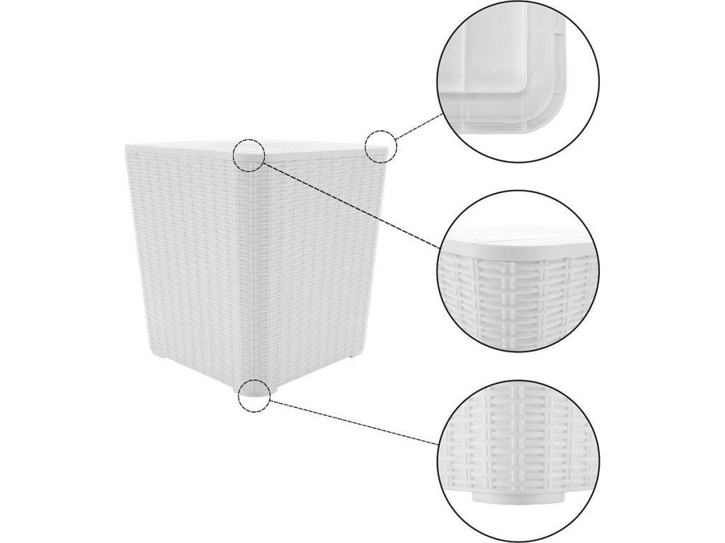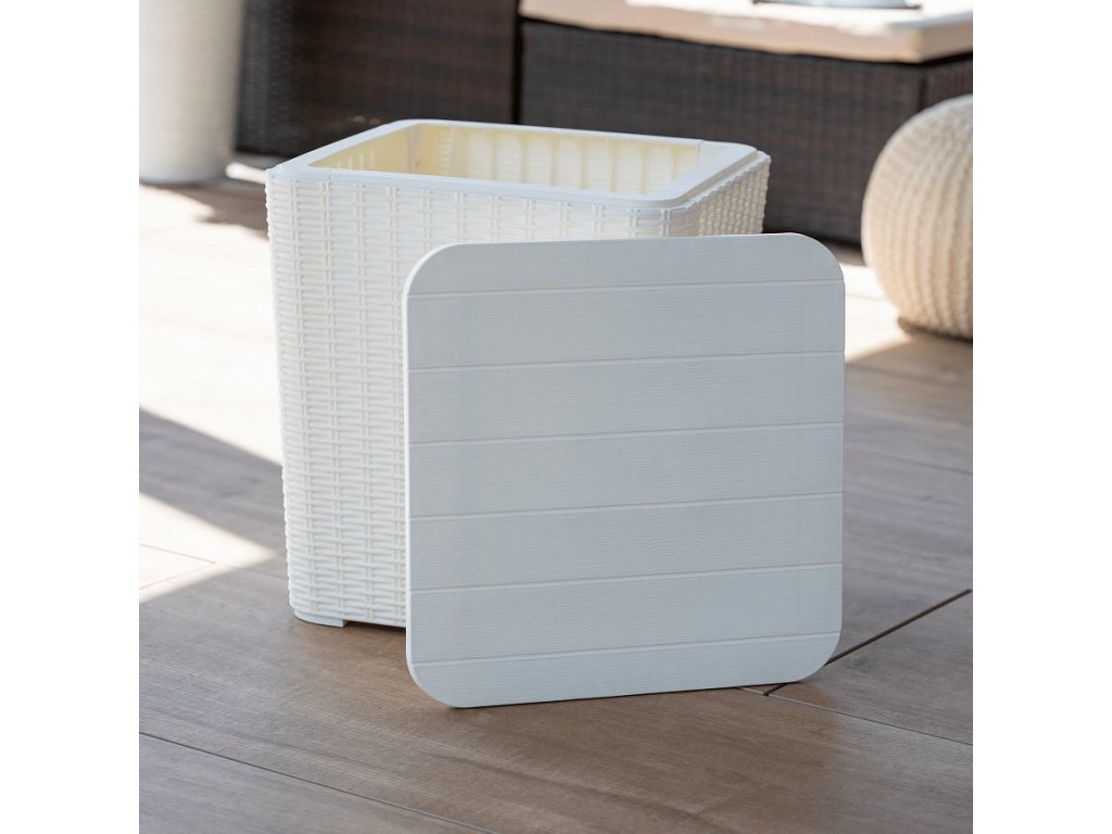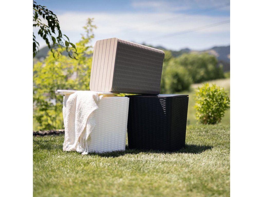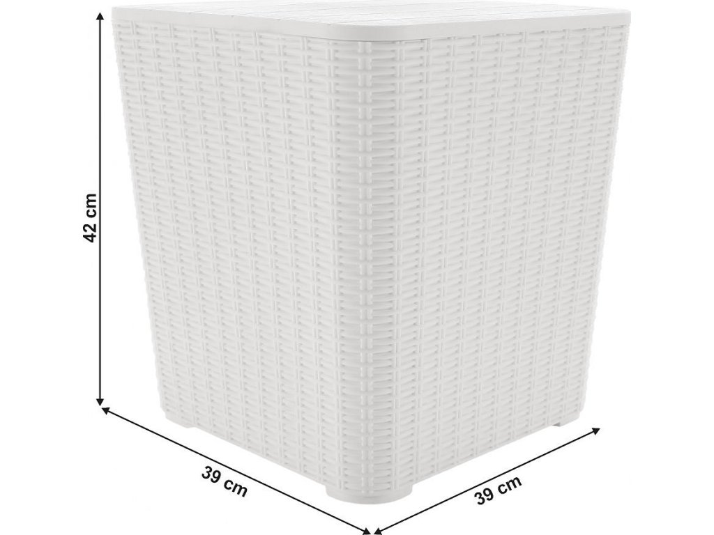 Materiál: plast Barva: bílá Rozměry (ŠxHxV): 39x39x42 cm Objem: 43 litrů úložný box Využití jakož i příruční stolek Nevhodný na sezení Dodávané v demontu