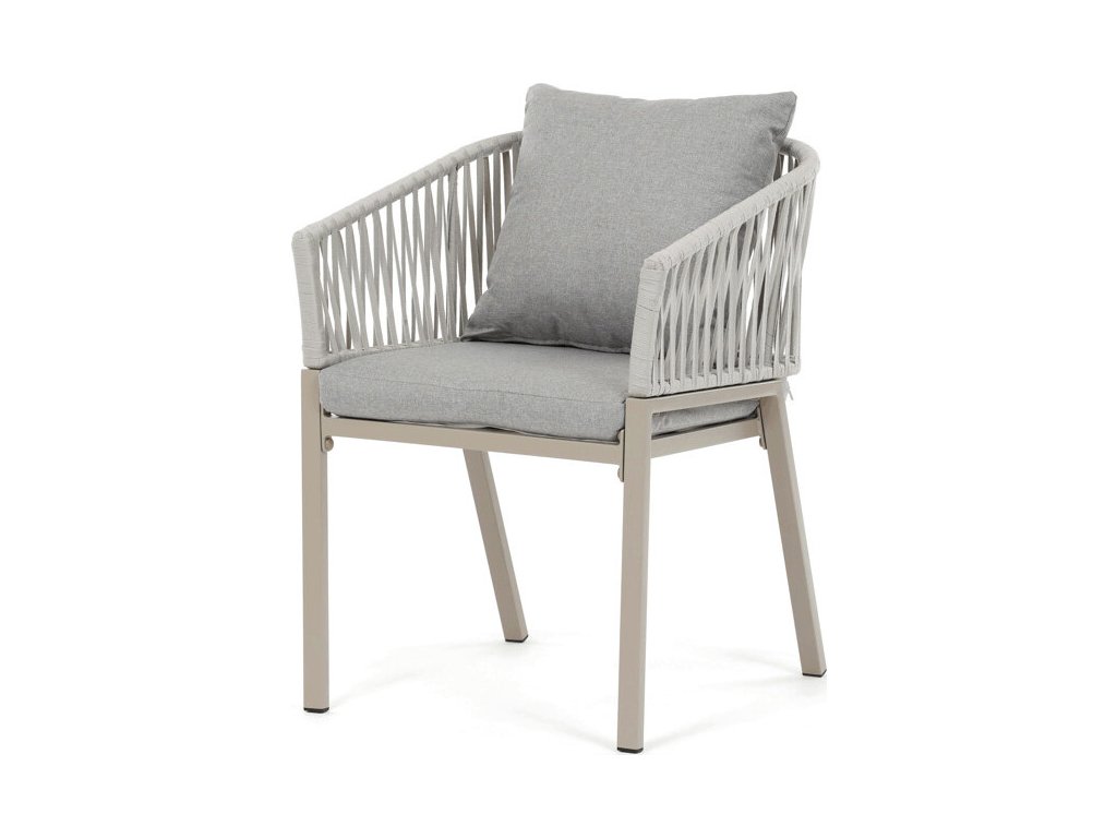 Zahradní židle v béžovém provedení spojuje stabilní kovovou podnož s pohodlným sedákem a opěradlem potaženým látkou v příjemném odstínu. Nadčasový design s jemnými liniemi a otevřenou konstrukcí opěradla vytváří vzdušný vzhled vhodný pro různé venkovní prostory. Židle je navržena tak, aby poskytovala komfort při posezení na terase, zahradě či balkóně, přičemž pevná kovová podnož zajišťuje dlouhodobou stabilitu a odolnost vůči povětrnostním vlivům. Látkový potah je příjemný na dotek a snadno se udržuje, což přispívá k praktickému využití v exteriéru. Celková konstrukce podporuje pohodlnou ergonomii a umožňuje relaxaci v přírodním prostředí.