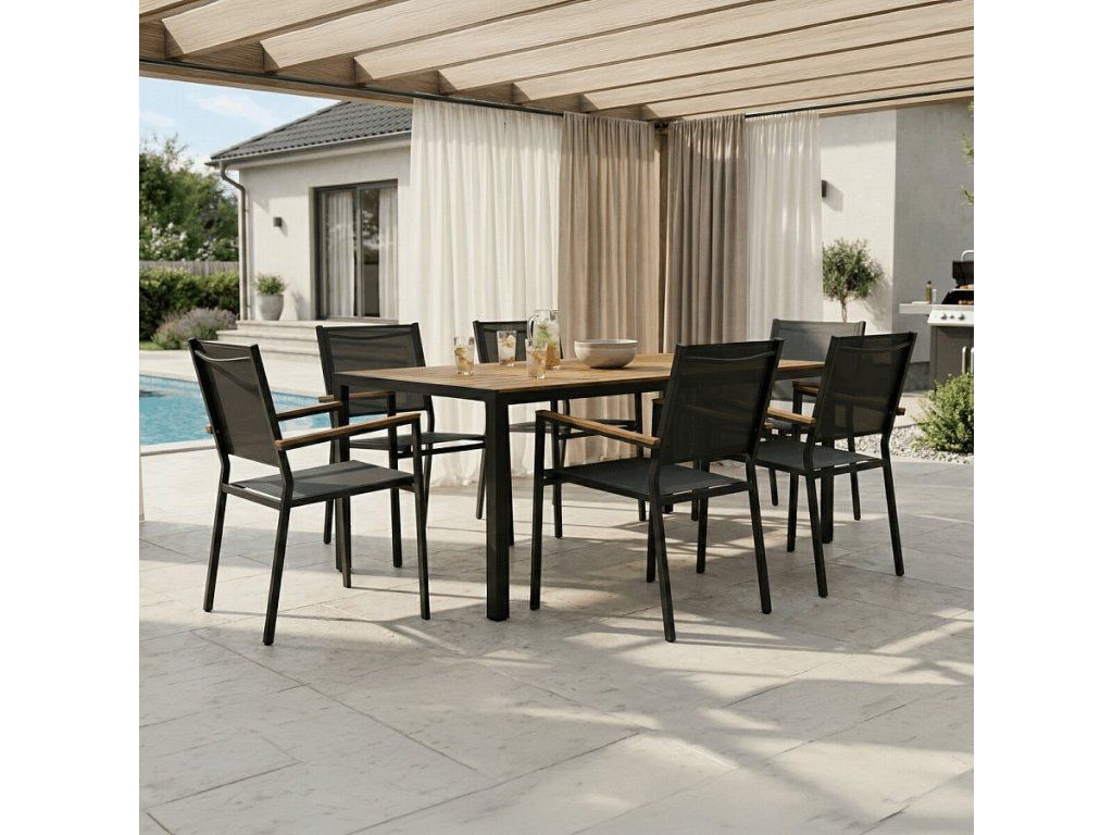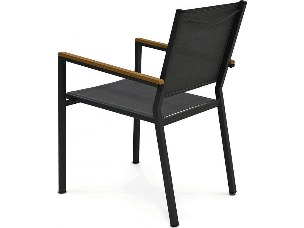 Zahradní židle s kovovým rámem v šedé barvě nabízí pevné a stabilní provedení vhodné pro venkovní použití. Sedák a opěradlo jsou potažené odolnou textilií, která zajišťuje pohodlí a snadnou údržbu. Přírodní polywoodové područky přidávají židli příjemný estetický kontrast a zároveň komfort při sezení. Díky možnosti stohování je židle praktická pro skladování a úsporu místa. Je ideální volbou pro zahradní posezení, terasy či balkony.