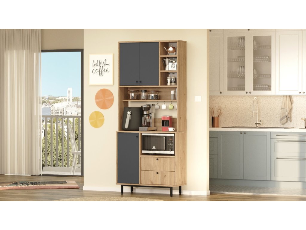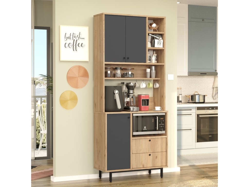 – Vysoká policová skříň na mikrovlnku s víceúčelovým designem