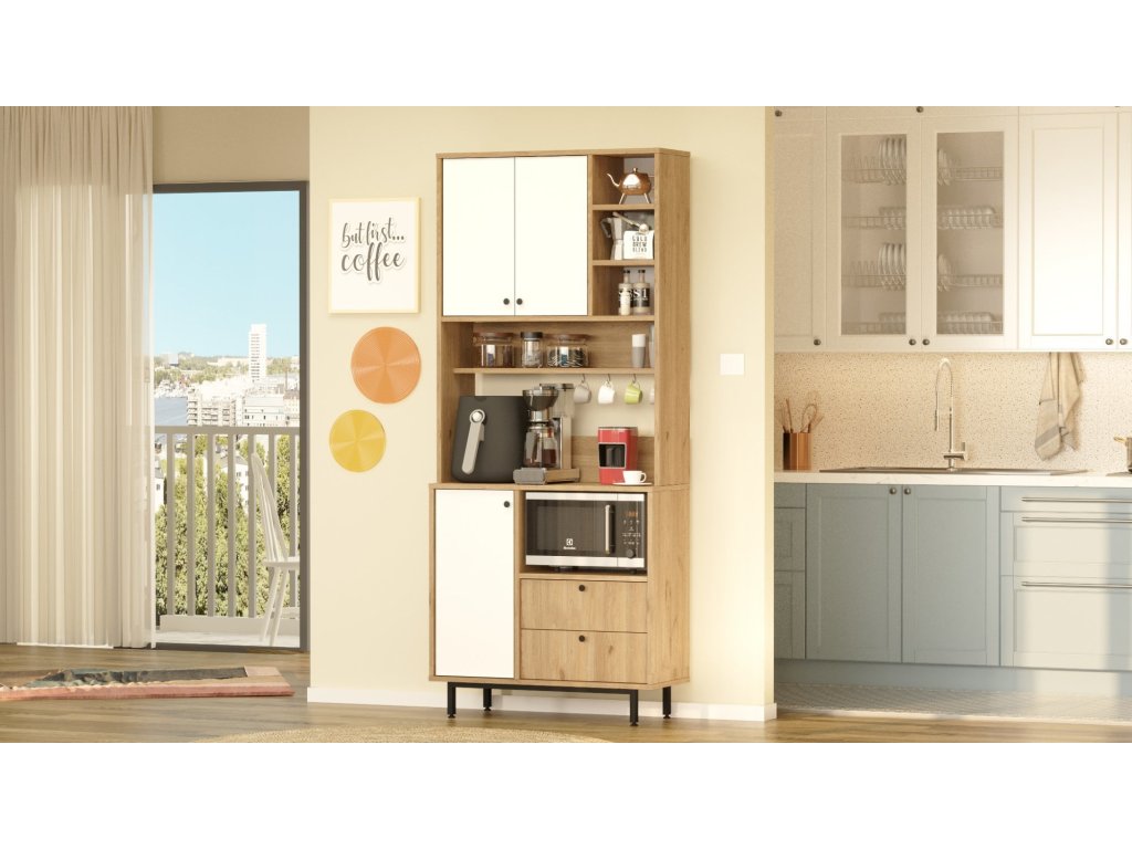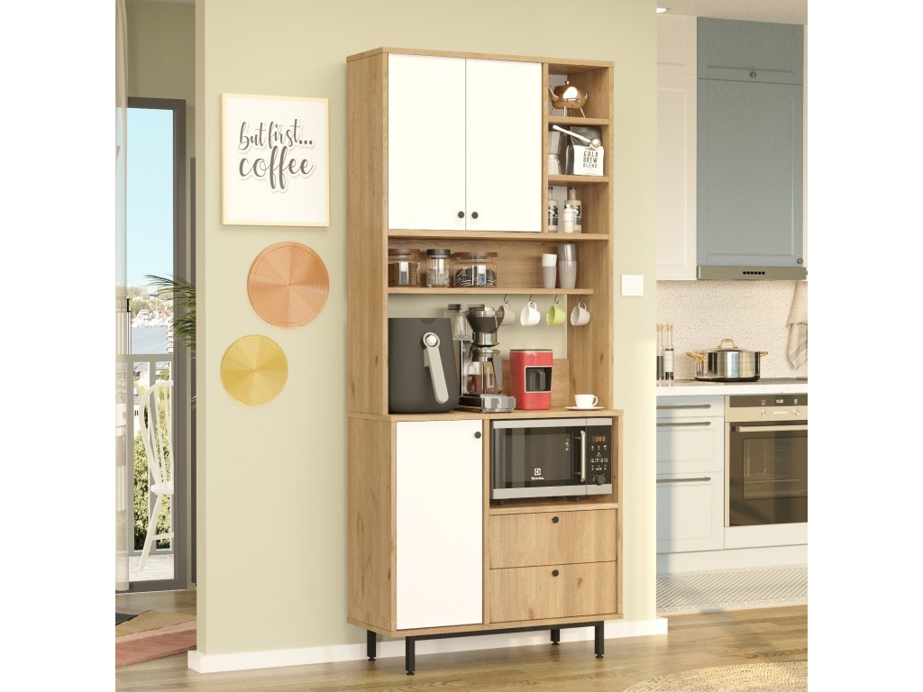– Vysoká policová skříň na mikrovlnku s víceúčelovým designem