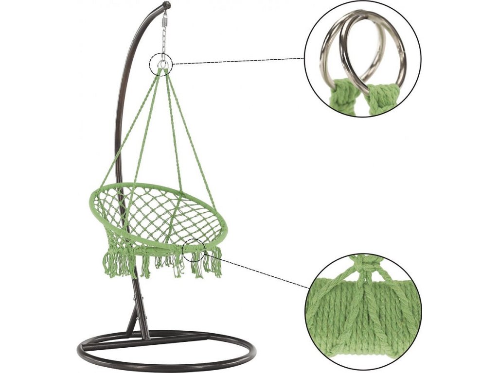 Závěsné křeslo AMADO v zeleném provedení. Houpací křeslo je vhodné jak do interiéru, tak do exteriéru. Základ křesla tvoří kovový rám, ke kterému se upevní 4 závěsná lana. Bavlněný výplet v zelené barvě zajistí pohodlí při sezení. Stojan není součástí, doporučujeme stojan Otan typ 2 dokoupit.