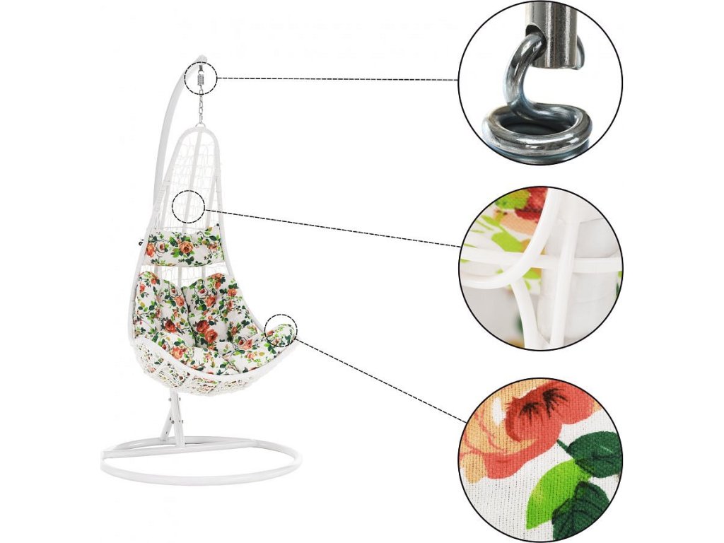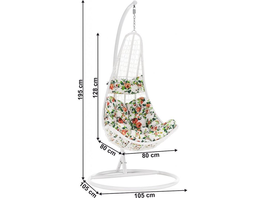 Závěsné relaxační křeslo KALEA se stabilní kovovou konstrukcí bílé barvy a sedacím prostorem ozdobně vypleteným z umělého ratanu. Zaručeně patří mezi nejpoužívanější materiály pro zahradní nábytek. Umělý ratan se může pyšnit svou odolností a dlouhou životností. Součástí ratanového relaxačního křesla je sedák s květinovým vzorem pro pohodlný odpočinek, polštářek a stojan. Ratanové křeslo je luxusním doplňkem do vašeho interiéru nebo venkovního prostředí.