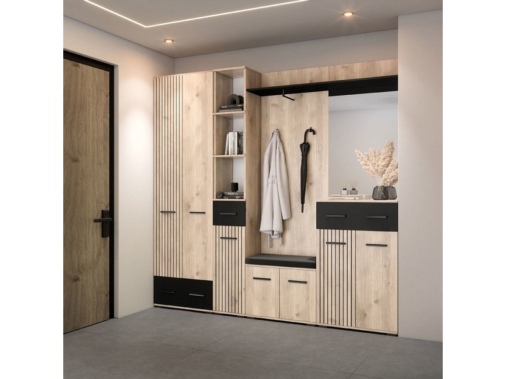 O stylový design Vaší vstupní části se postará moderní předsíňová sestava . Kombinace moderních barev a předních dvířek imitujících trendové lamely jí dodává jedinečný charakter.