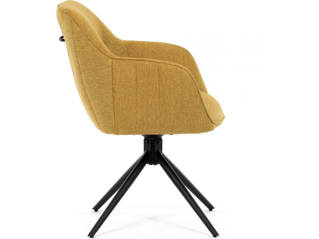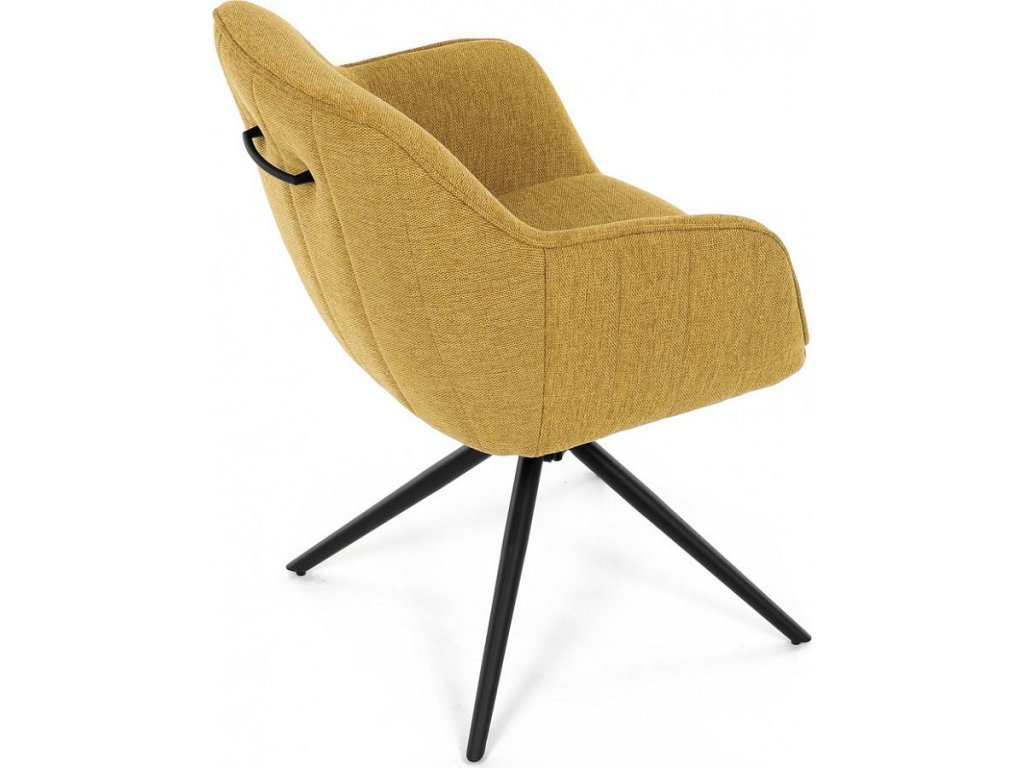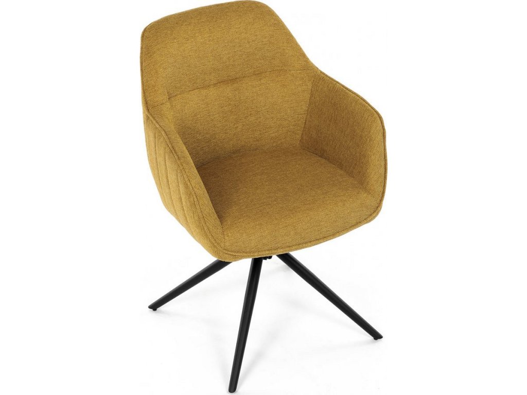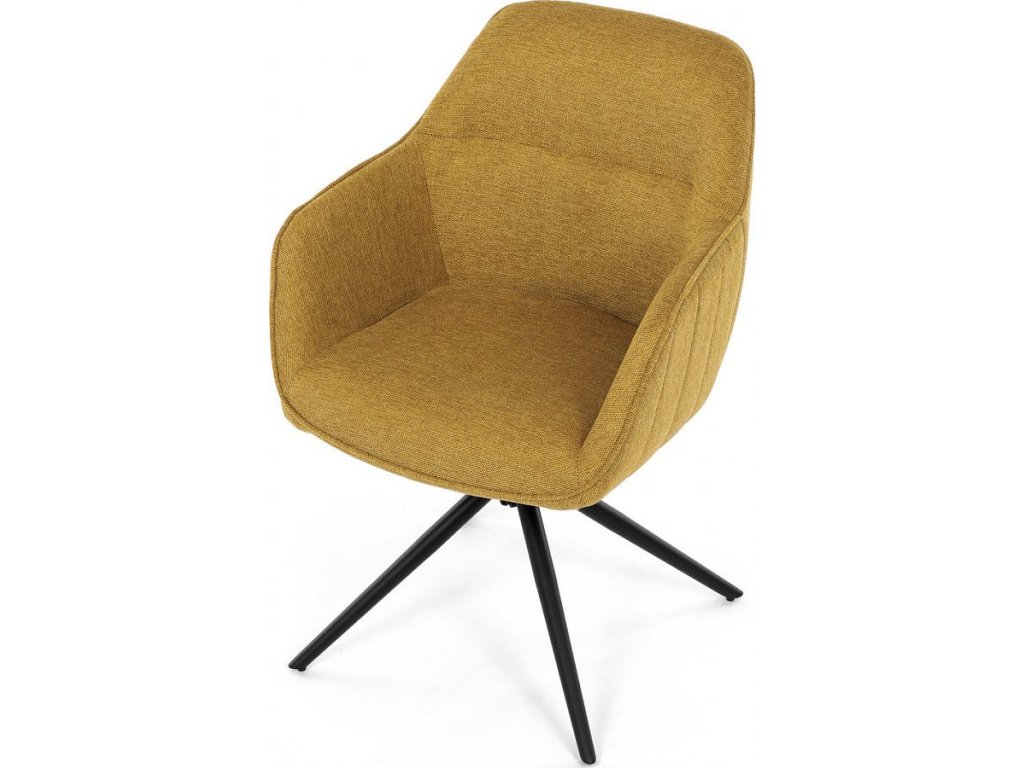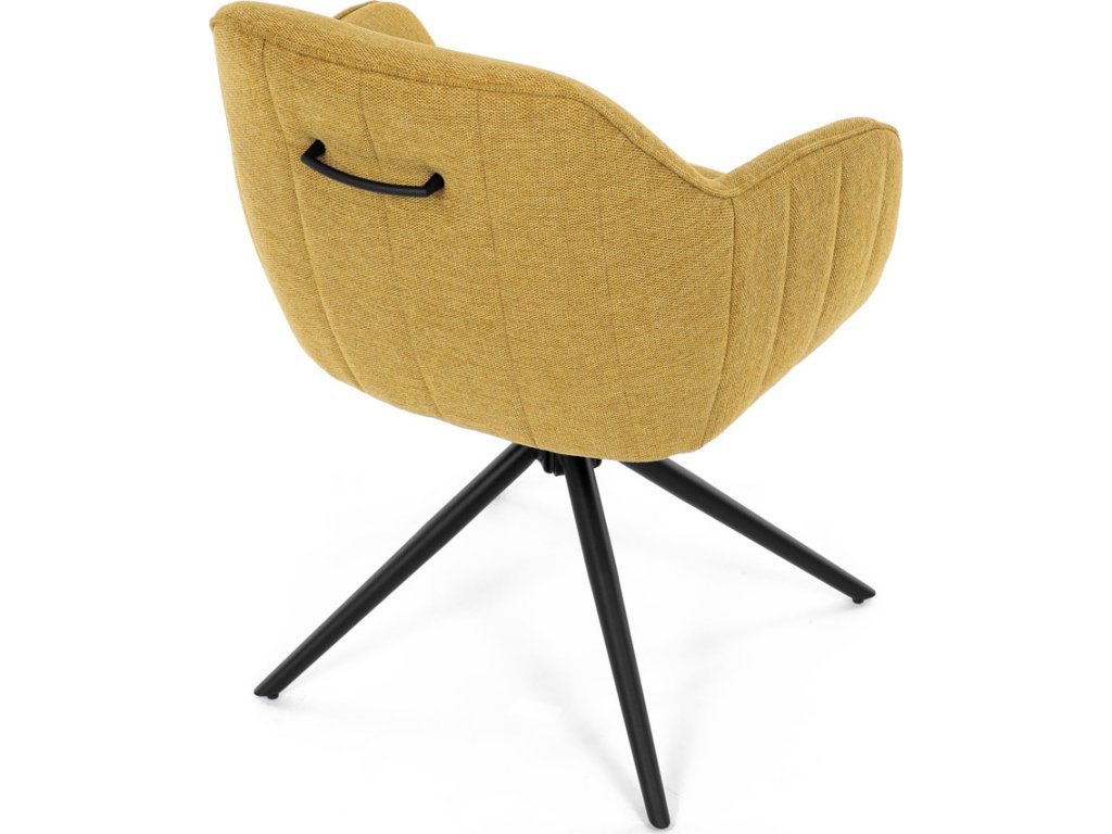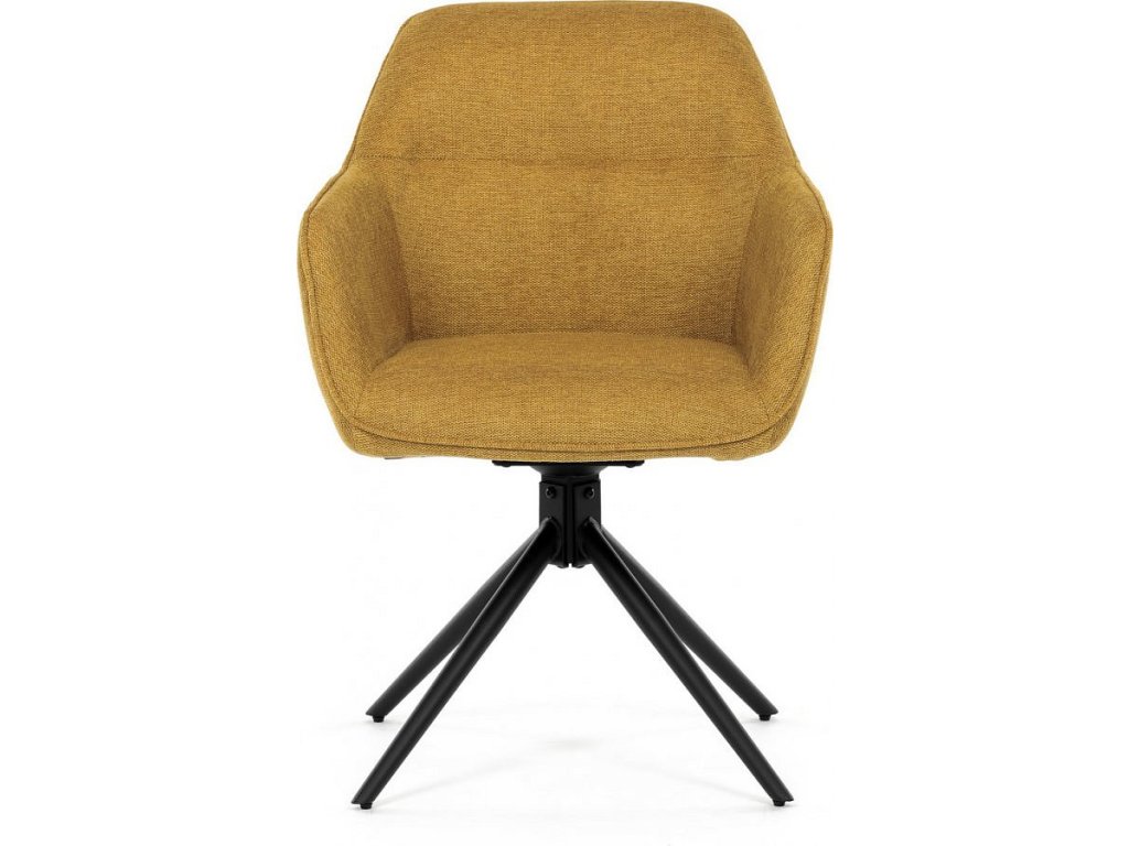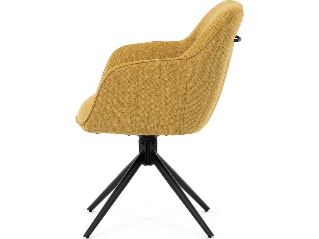 Moderní jídelní židle ve žluté barvě s efektním prošitím zádové i přední části opěráku. Prošití je v brvě potahového materiálu. Zadní část opěráku je opatřena vkusným madlem pro snazší manipulaci. Čtyři kovové nohy v matném práškovém nástřiku vycházejí z centrálního bodu ve středu sedáku. Sedák je otočný o P90°+ L 90° s vratným mechanismem - funkce reset.