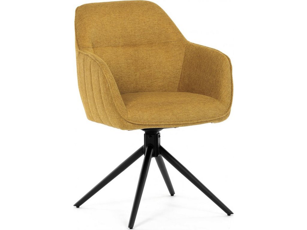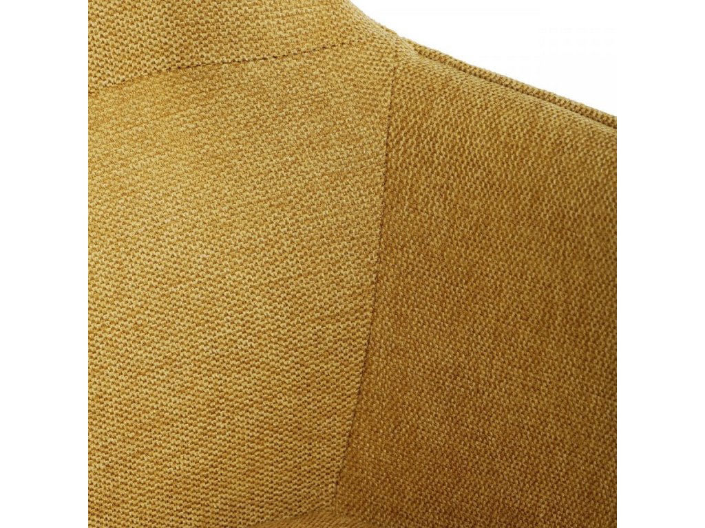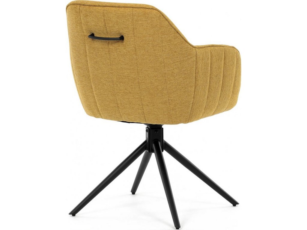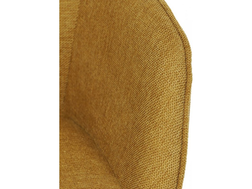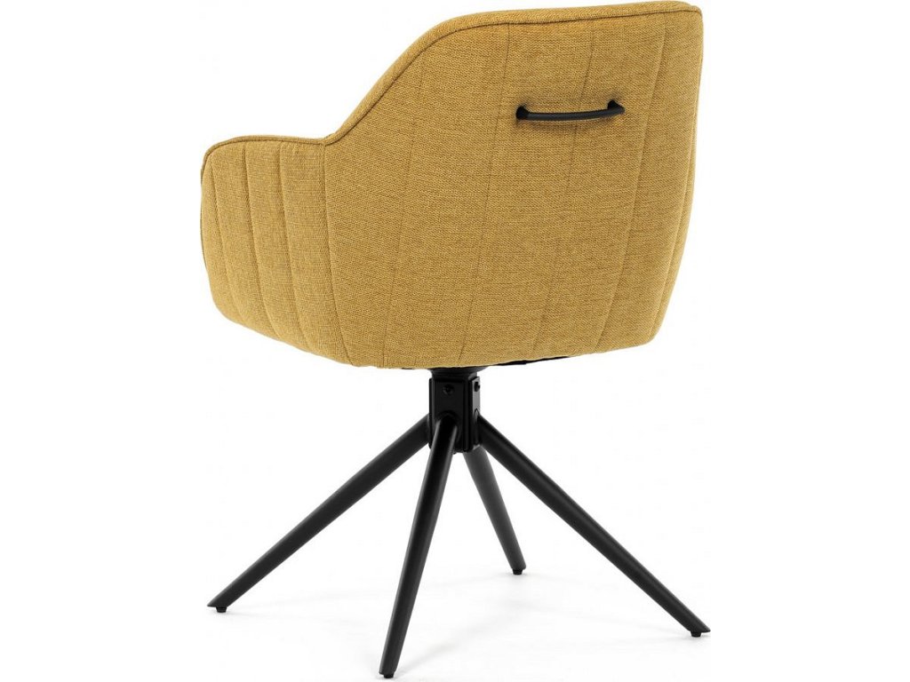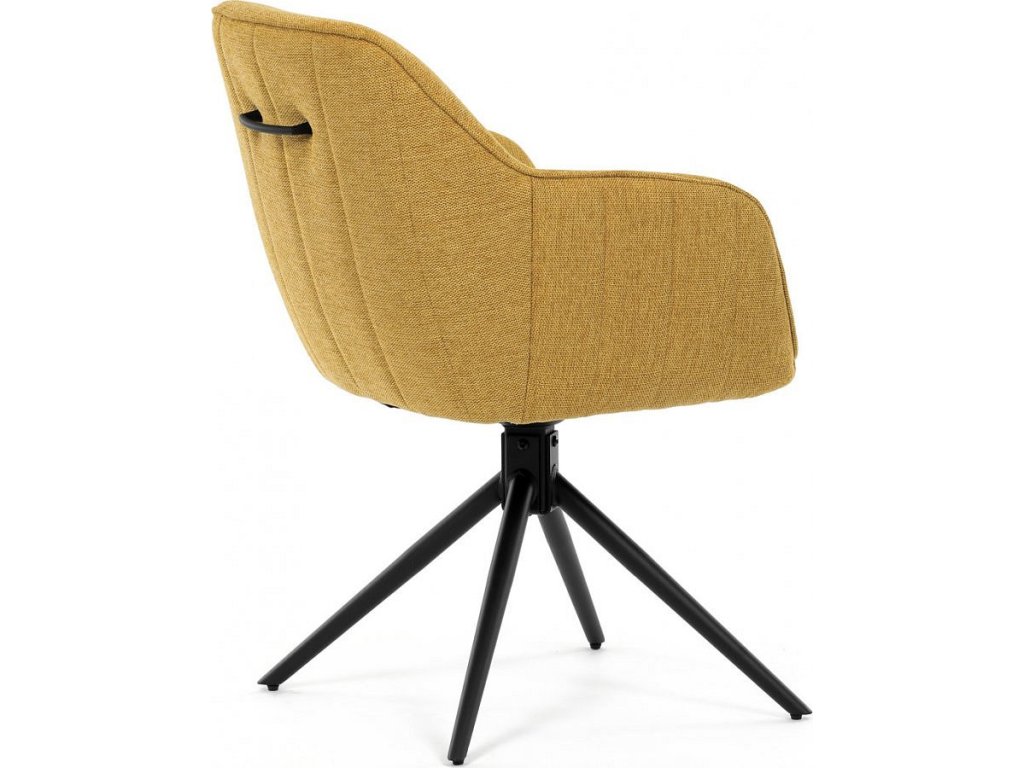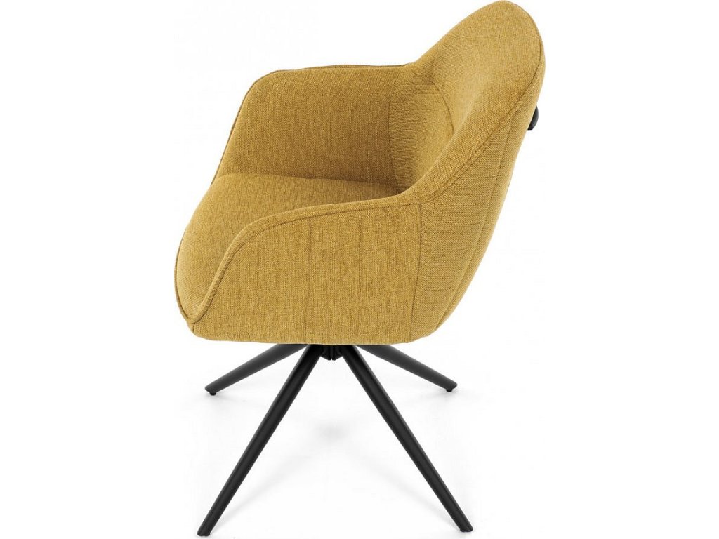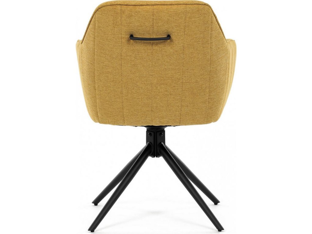 Moderní jídelní židle ve žluté barvě s efektním prošitím zádové i přední části opěráku. Prošití je v brvě potahového materiálu. Zadní část opěráku je opatřena vkusným madlem pro snazší manipulaci. Čtyři kovové nohy v matném práškovém nástřiku vycházejí z centrálního bodu ve středu sedáku. Sedák je otočný o P90°+ L 90° s vratným mechanismem - funkce reset.