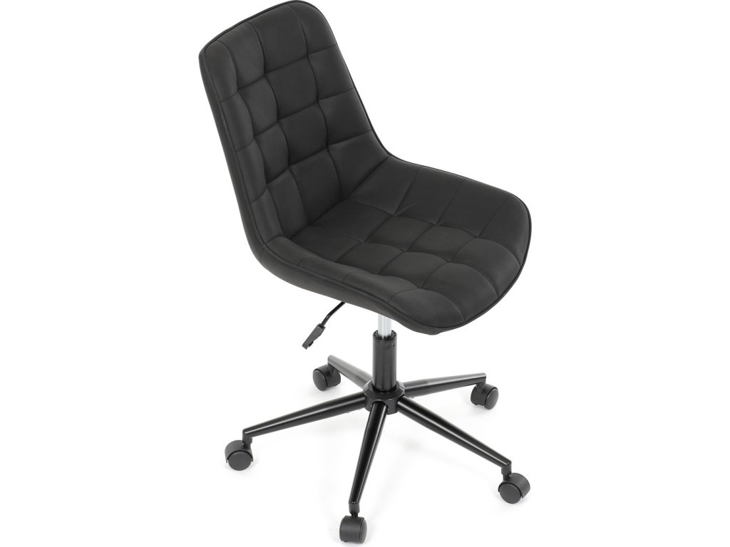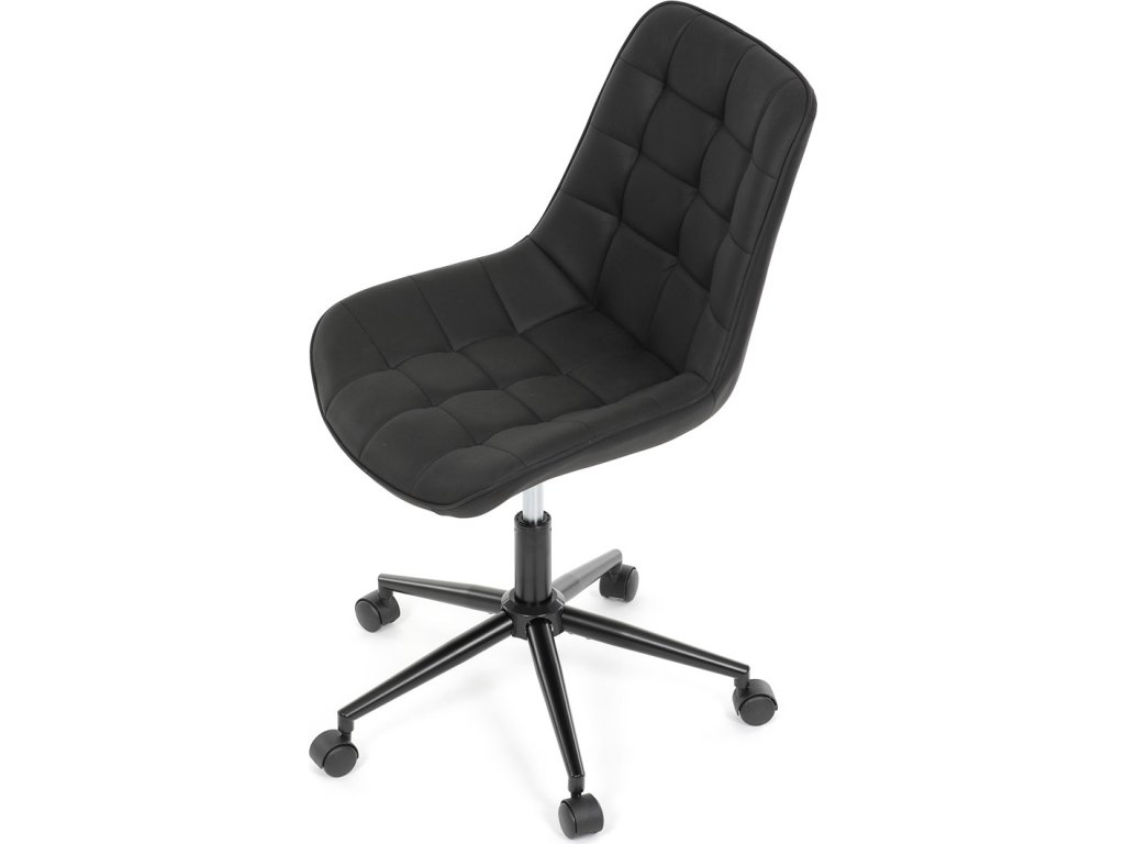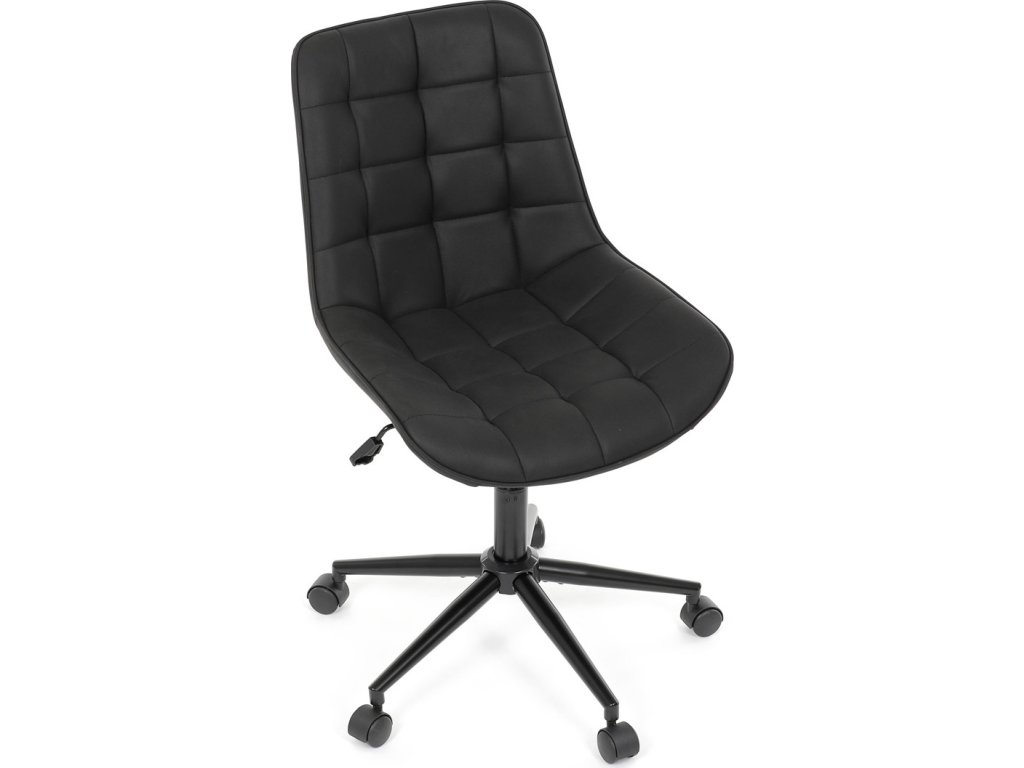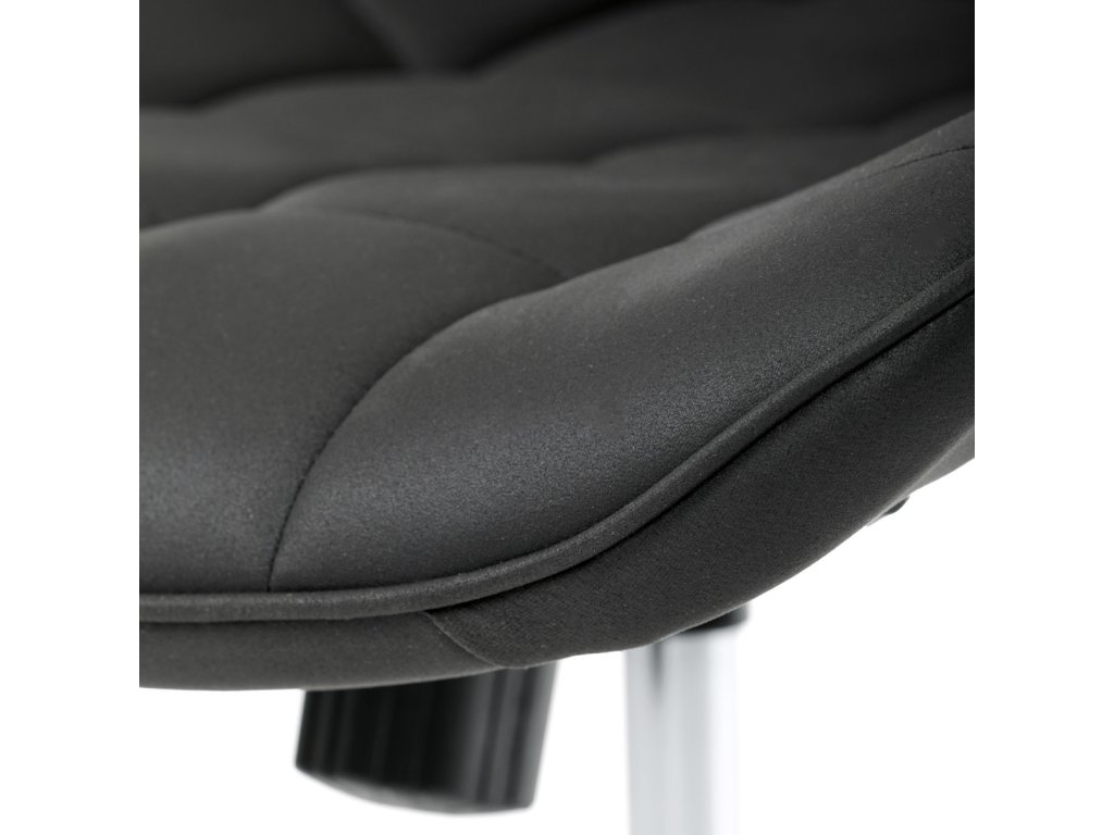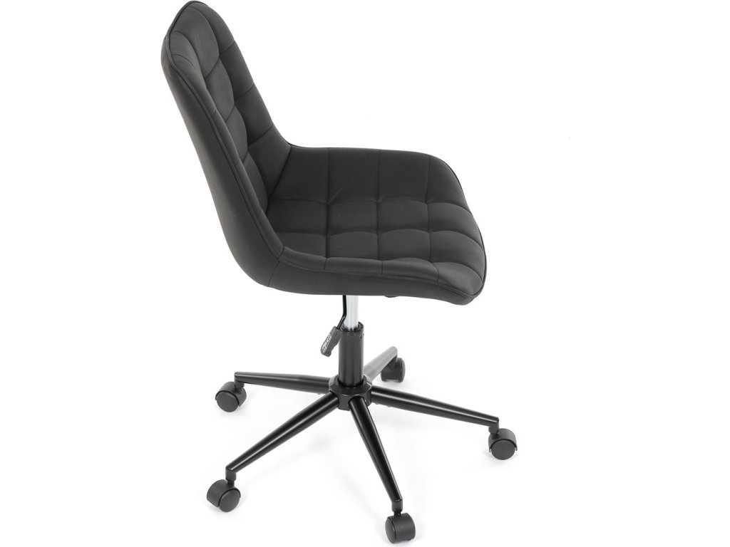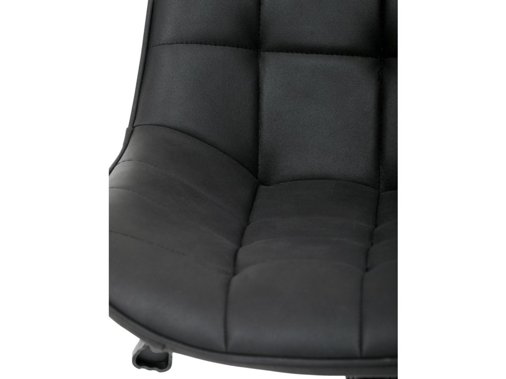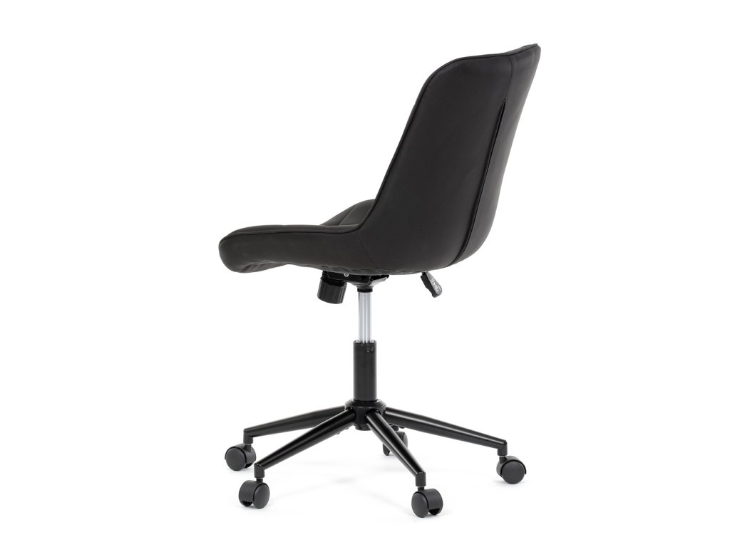 Kancelářská židle s černým potahem v dekoru broušené kůže nabízí moderní vzhled a komfortní sezení. Sedák i opěradlo jsou čalouněné kvalitní látkou, která je příjemná na dotek a snadno se udržuje. Pevný kovový kříž zajišťuje stabilitu a odolnost, zatímco houpací mechanika umožňuje plynulé naklápění pro uvolnění během práce. Výškově nastavitelná sedací plocha umožňuje přizpůsobení výšky podle individuálních potřeb uživatele. Absence područek a bederní opěrky podtrhuje minimalistický design vhodný do různých pracovních prostor.