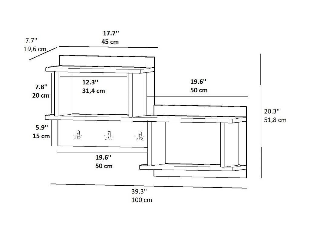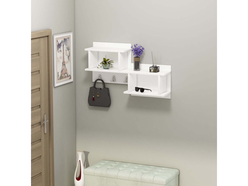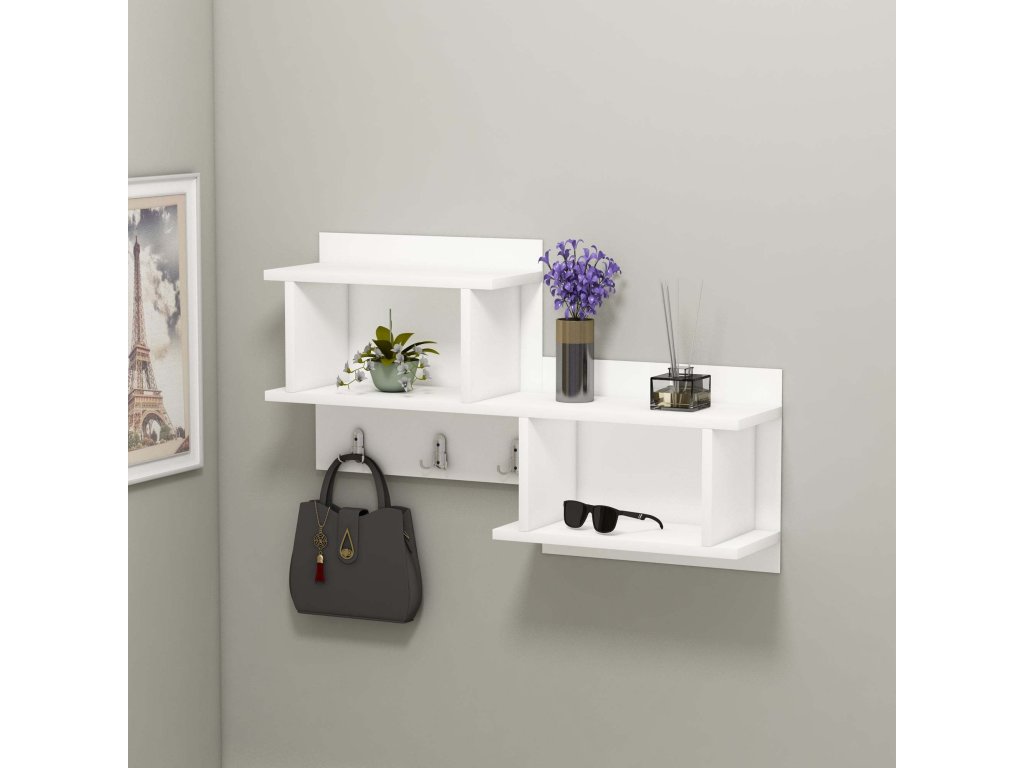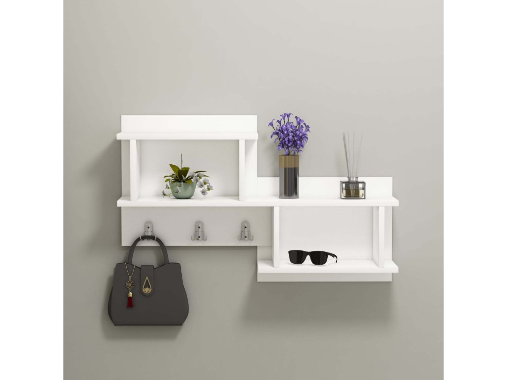 Nástěnná police nabízí funkční design a univerzální využití. Díky integrovaným věšákům a dostatečně prostorné odkládací ploše je ideální pro kuchyň i koupelnu. Její moderní provedení a obdélníkový tvar zajišťují, že snadno zapadne do každého interiéru.